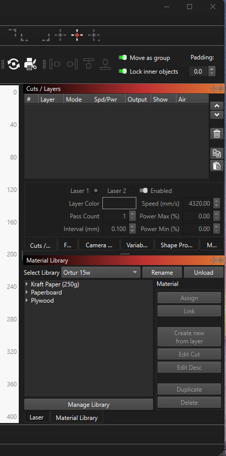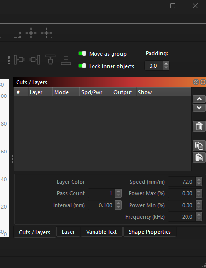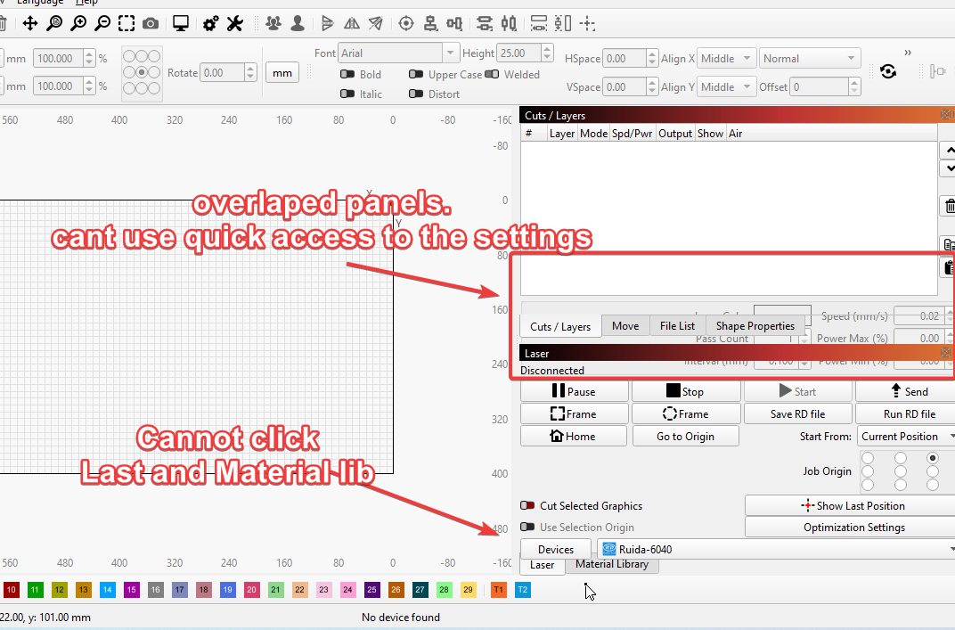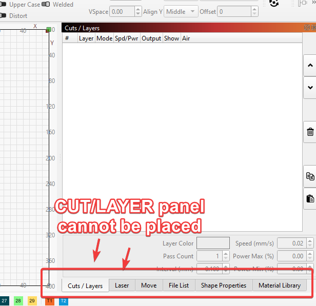 That’s exactly what I did. I ended up with combining two panels to a single panel. See my screenshots above. But this is not how Lightburn was before. I had to update to 1.7+ because now I work with galvo too. Version 1.6 was working perfectly with my old CO2 laser. All panels were very accurate. Sizes of icons and fonts were perfect. With version 1.7+ even after making icons very small Lightburn panels live their own life. Absolutely uncontrollable. Even the “Window → Reset to default layout” produces different result every time I use it.