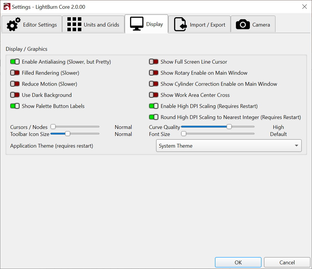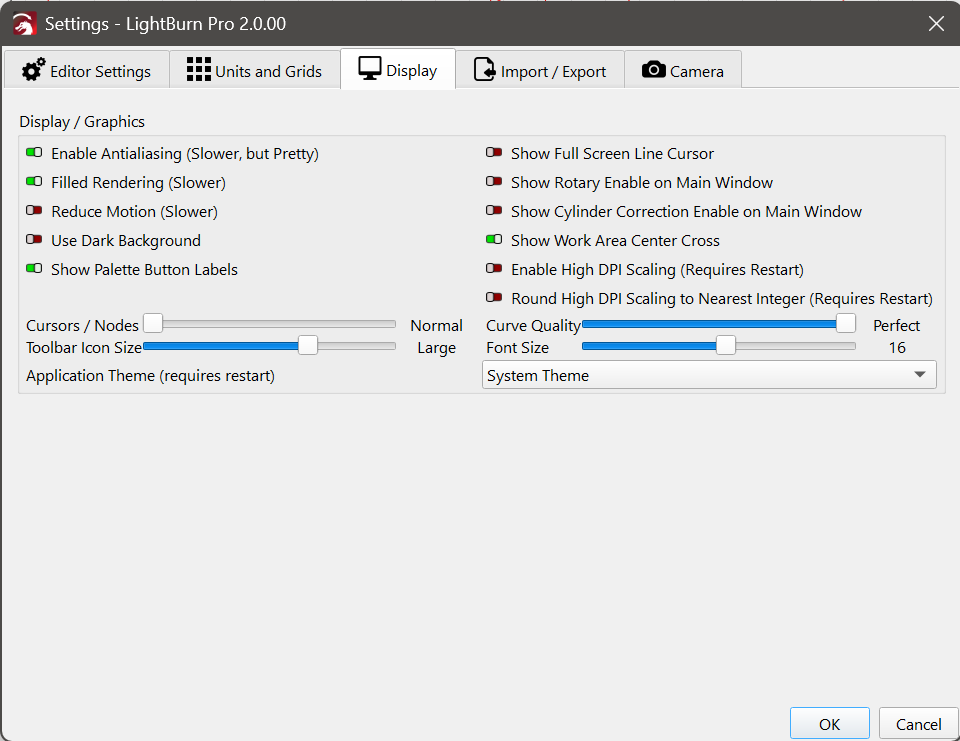 Now the font/Tool bar sliders will scale LightBurn to your preference independent of Windows Scaling: