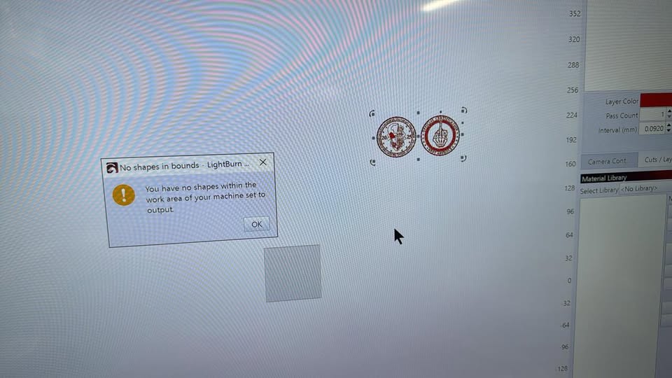 Anyways that isn’t that bad part. Bad part is the error YOU HAVE NO SHAPES WITHIN THE WORK AREA OF YOU MACHINE SET TO OUTPUT. Sure you put them there so when I try to close the dialog box it won’t close. X won’t shut it down. Nothing removes it from the screen. And can’t do anything to move the object’s to the work area. The error box just flashes.
