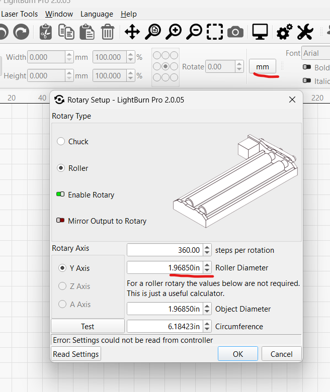 I don’t often use my Rotary, however yesterday when i went to use it I was unable to get the roller diameter to switch to mm. Is there a new setting someplace to make this change to mm. I used to just change it on the main bar. See image below please. Thanks in advance.