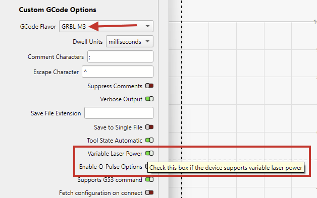 To use M3, change the GCode Flavor to GRBL M3 and enable “Variable Laser Power” in the Device Settings: