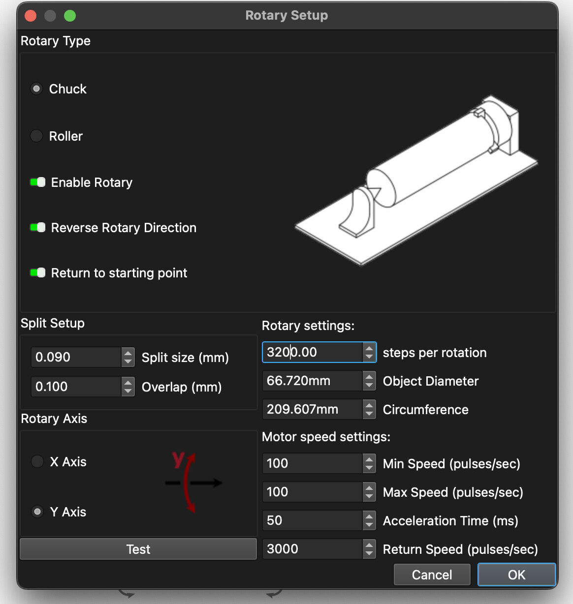 I just tried with thouse settings and got random results. Inconsistent. It is better. It starts engraving ok, but sometimes in the middle of the work start engraving gibberish and random spinning. After that, i try the same project , the same material, it engrave whole but with inconsisten lines. I mean distance between mark lines somewhere are spectacular, somewhere are disaster. Can someone check also and see? Thanks a lot everyone!