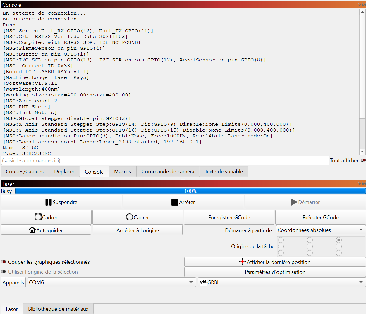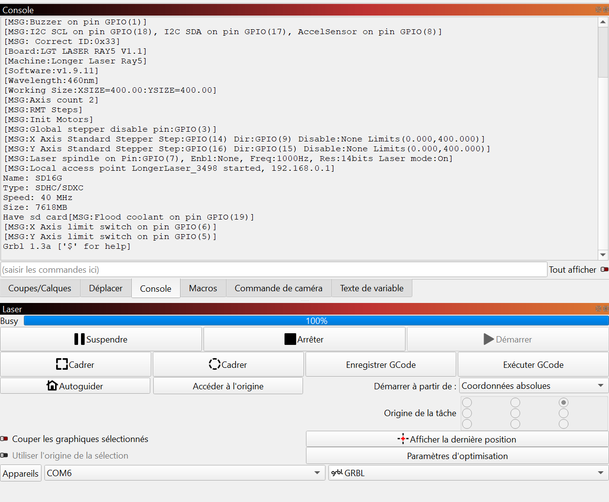 I am having a connection issue with my Longer Ray5 laser. As soon as the machine connects, LightBurn status switches to “Busy 100%” and I cannot move the laser or run any jobs.