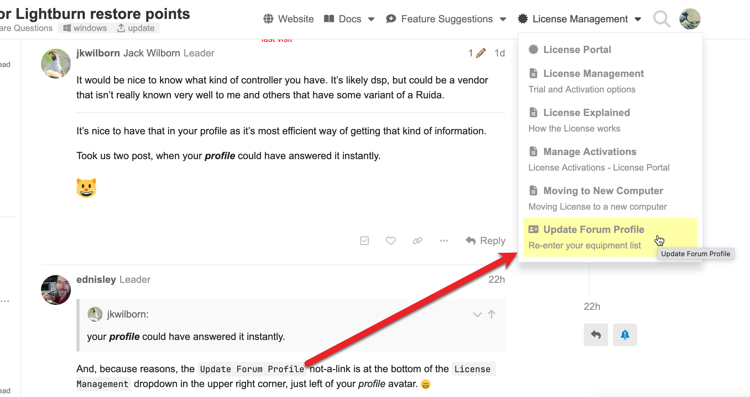And, because reasons, the Update Forum Profile not-a-link is at the bottom of the License Management dropdown in the upper right corner, just left of your profile avatar.