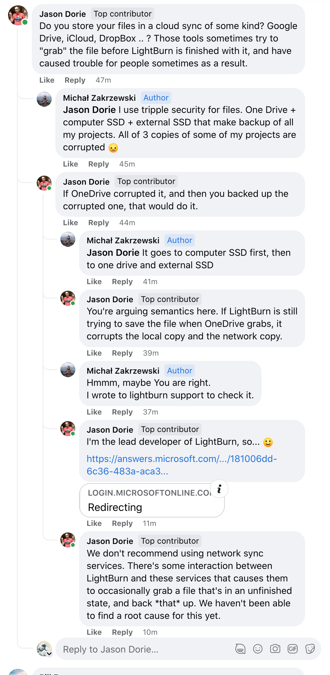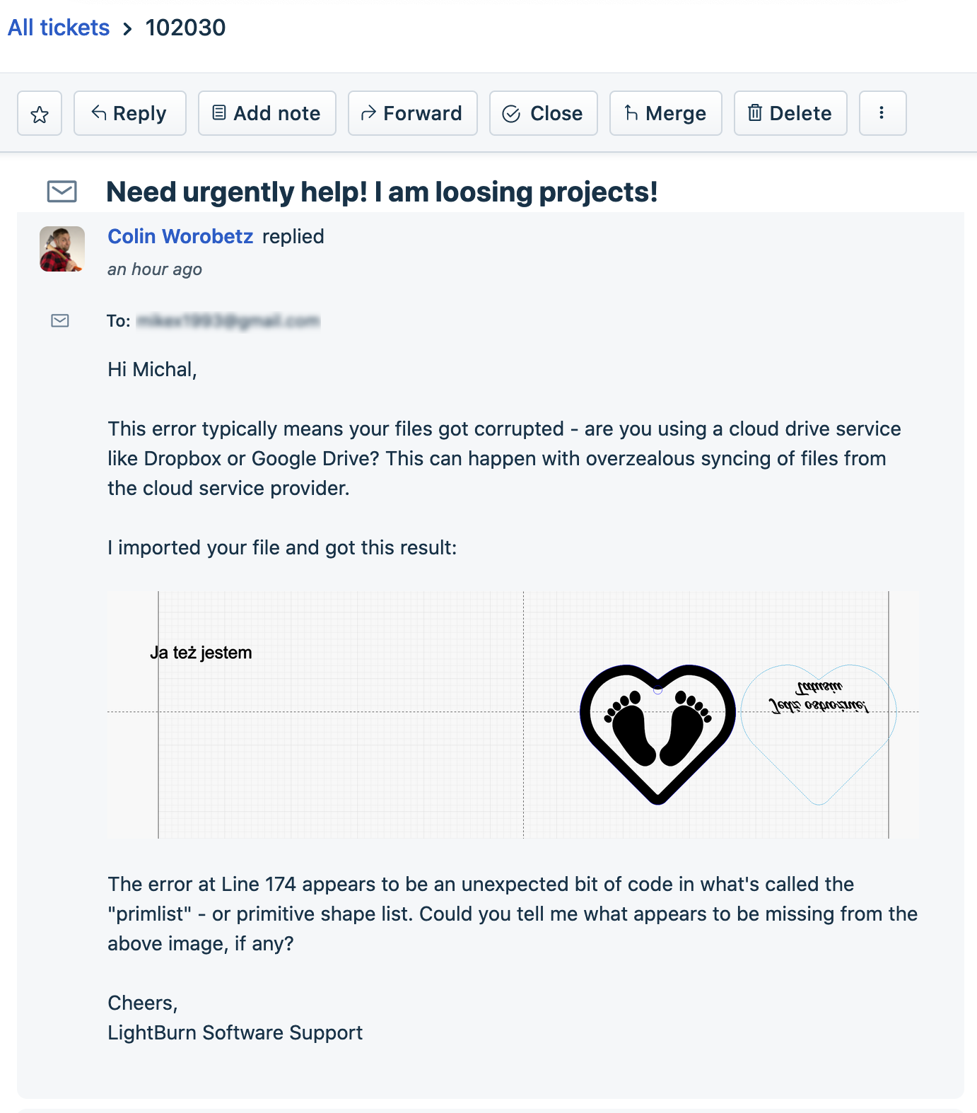 It looks like you reached out via Facebook, our email support system as well as posting here for answers. Please don’t do that. When needing answers quickly, directly from us, the developers of LightBurn, it is best to post here or email support. Doing all will not get you faster service.