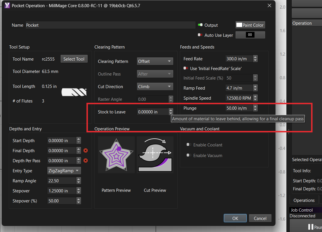 No that is not it, see how you have the Clearing pattern set to Offset and your Outline pass is greyed out? That is because there is no Outline pass, it still allows the Stock to leave value to be entered.