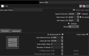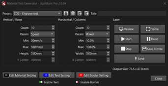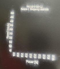 This is how the first run of the material test went. I used the CO2 engrave test pre-sets as-is. The text came out (yes, the next test run will have a much higher speed than 60mm/s), but none of the squares were etched. The technician running the machine reported that the gantry and head were moving as if it were lasering, but there was no output.