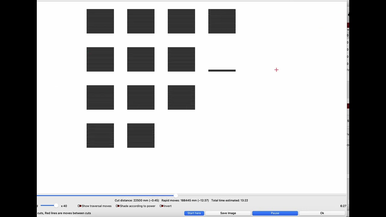 Also be aware those tiny squares may not be translated into your project, unless you are doing tiny burns or cutouts. I often use fewer squares 25mm on a side, or even rectangles. The Material Test tool is adjustable for your benefit.
