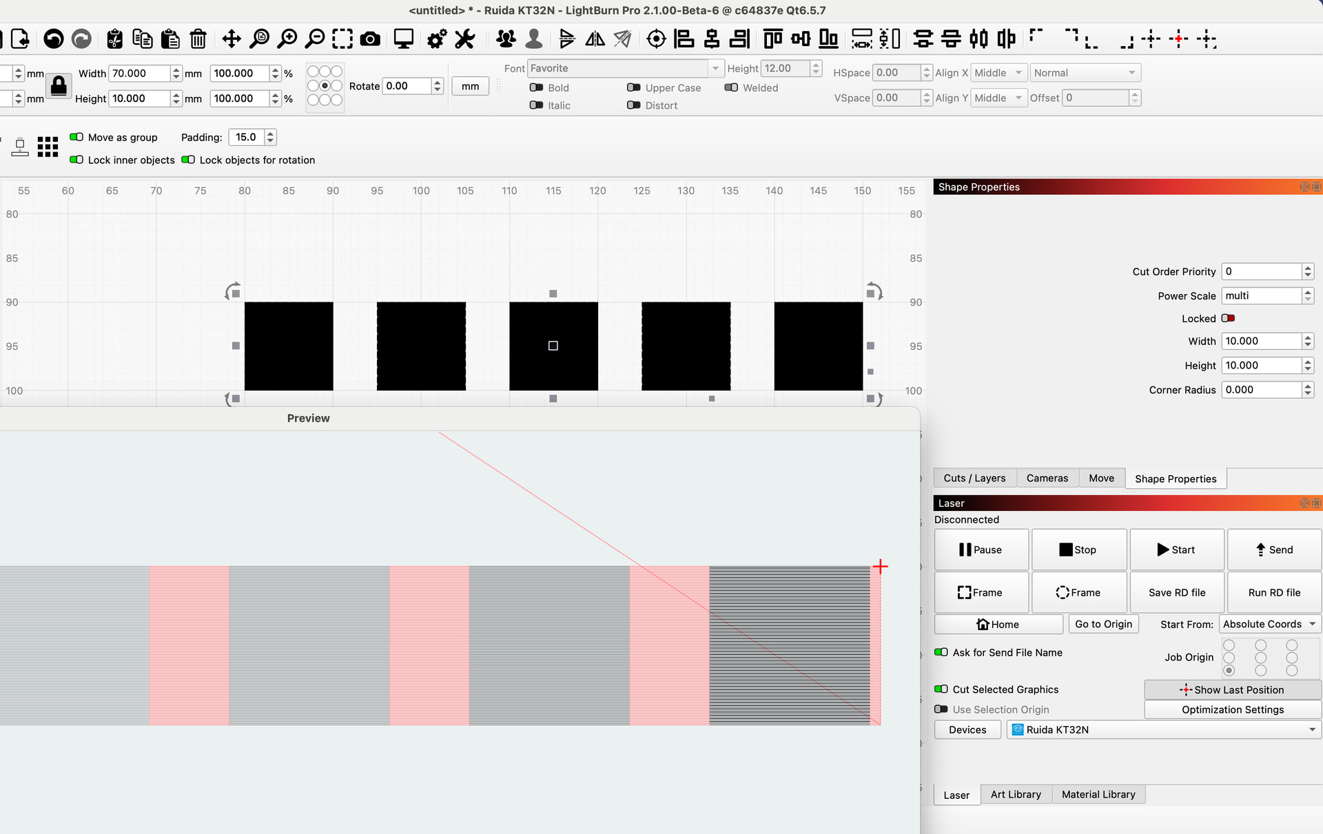 As a result of the lightburn programmers refusing to treat each row as a group each square is on its own layer which forces light burn to burn each square individually (which also makes the three radio buttons that are shown useless. That was a waste of time to put them there because they don’t work during a material test) which in turn does NOT allow the laser head to get to full speed.