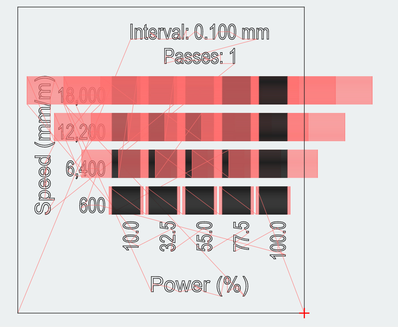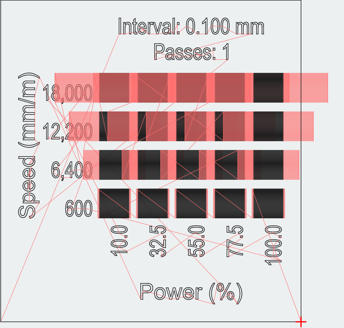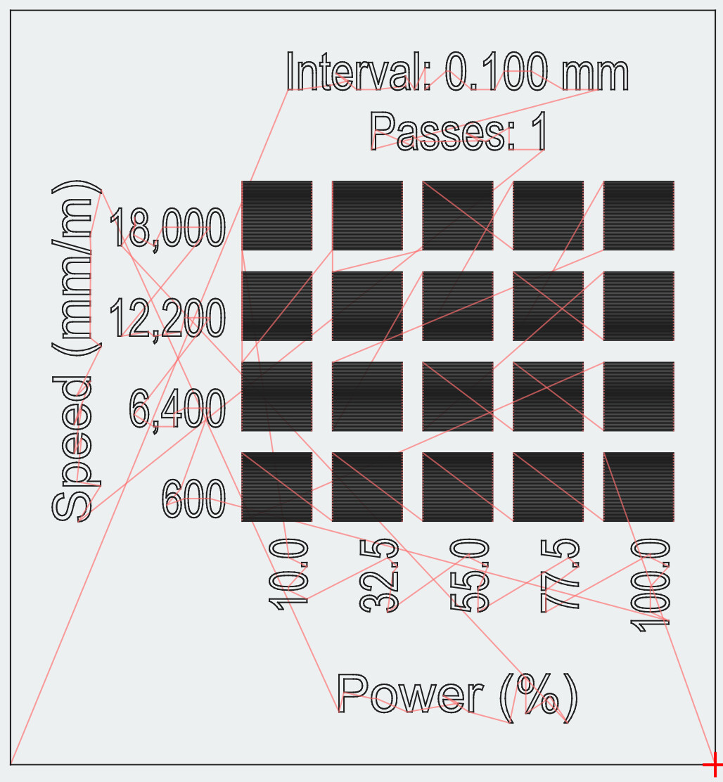 I absolutely agree that the laser cannot get to higher speeds on the material test when using line mode. In fill mode though there is the overscan setting, which you can change to allow the laser to reach speed before firing. Look at the traversal lines in the previews below. This is with no overscan. No traversal lines extending beyond the test square. Impossible ofr the laser to reach speed.