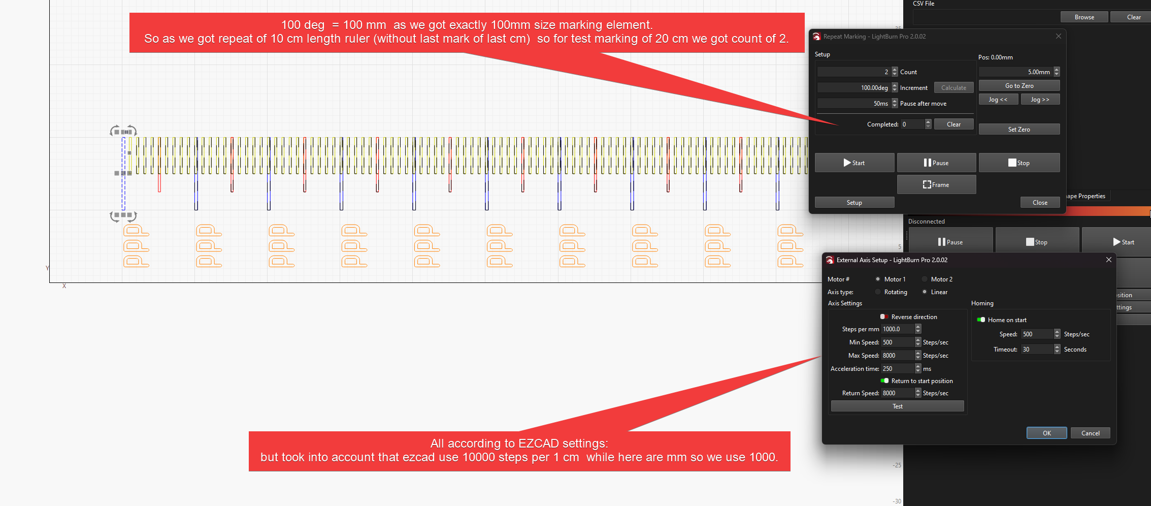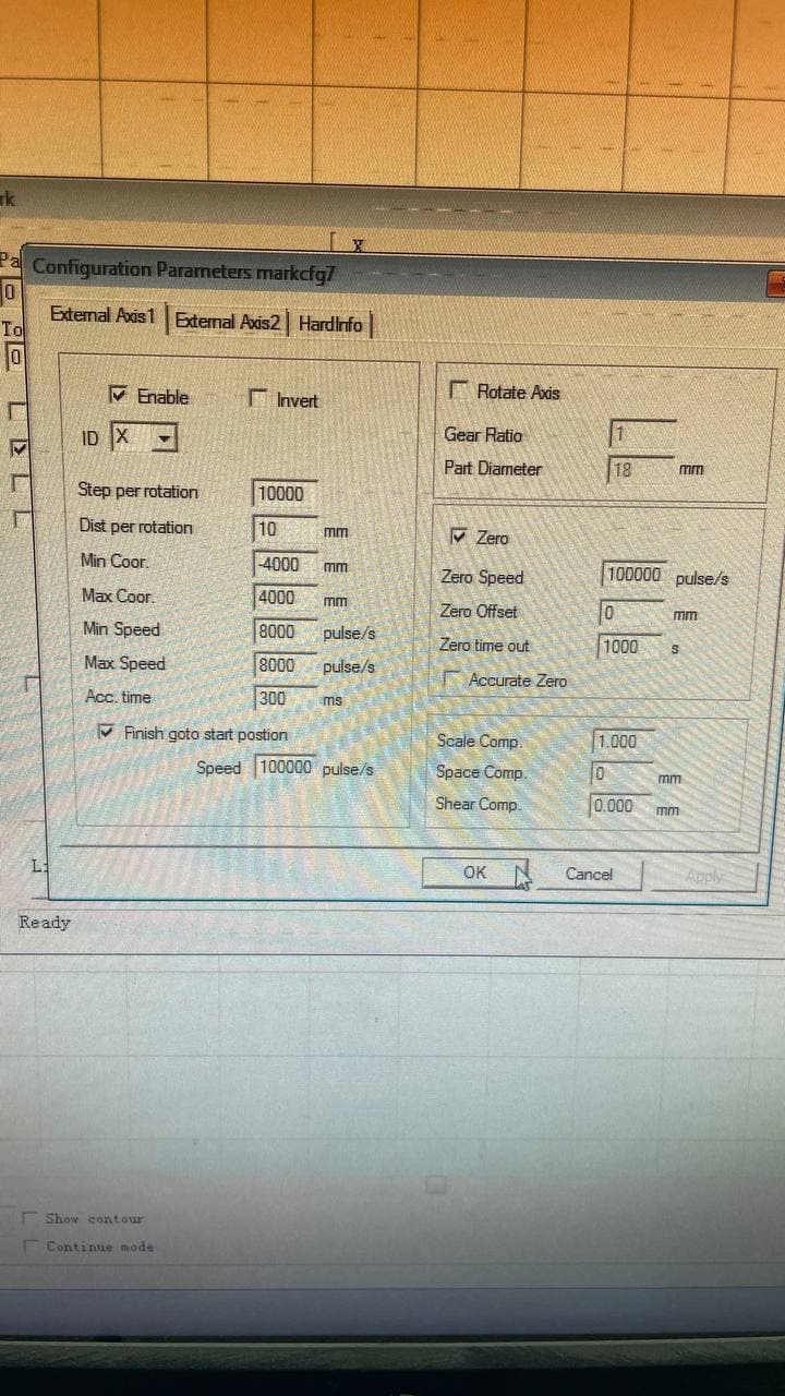 Since there is no identical parameter set between Lightburn and EZCad, we recalculated the parameters mathematically and entered the values. The mechanism started working, but only within 1 meter, while we need 4.5 meters. We cannot set values larger than the current ones…