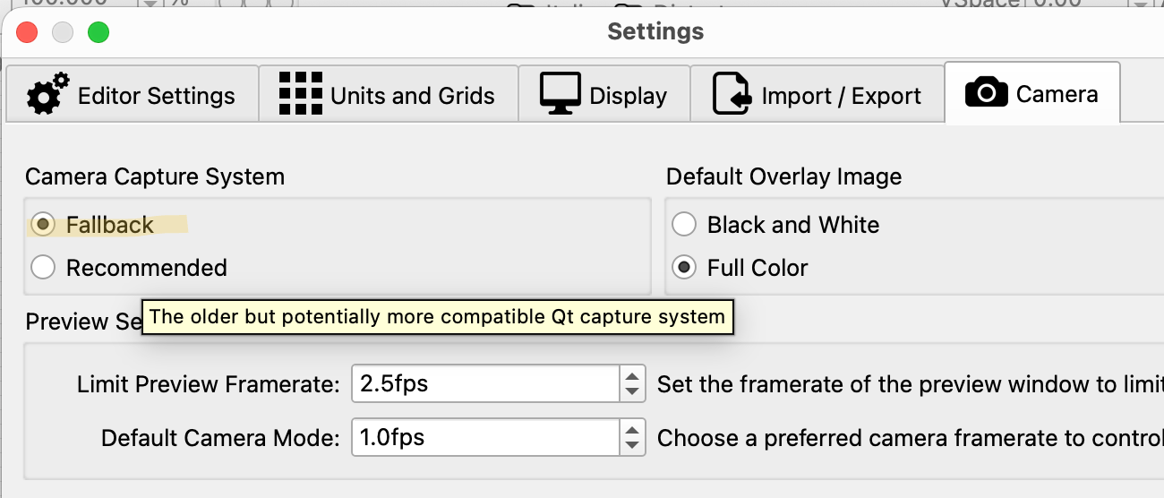 In Edit>Settings>Camera, try the ‘Fallback’ camera system.