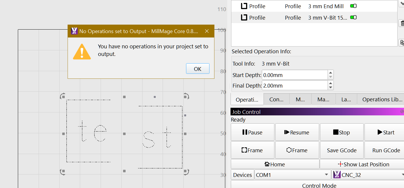 Tried again, restarted MillMage and a new similar design from the beginning, after the Cut Shapes the Mill operation assignment goes away as the firdt time with a saved project.
