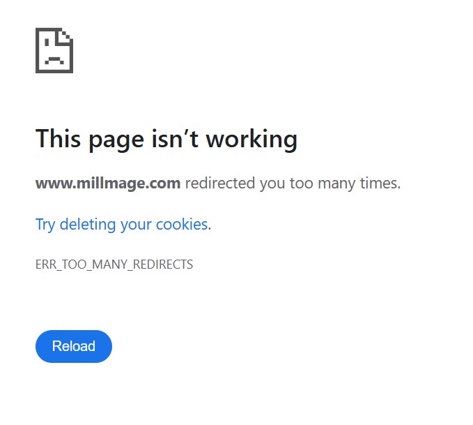 I just tested it. When I go to millmage.com it redirects to millmagesoftware.com. When I try www.millmage.com I get a too many redirects error. Try it without the www.