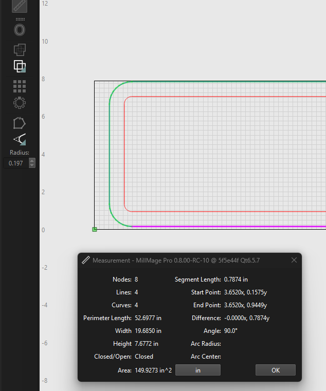 When I try to use the measure tool, the tool shows selected, the screen goes grey, and no window pops up. Line segments show being moused over, but that is the only thing that works. I have to shut MillMage down to regain control.