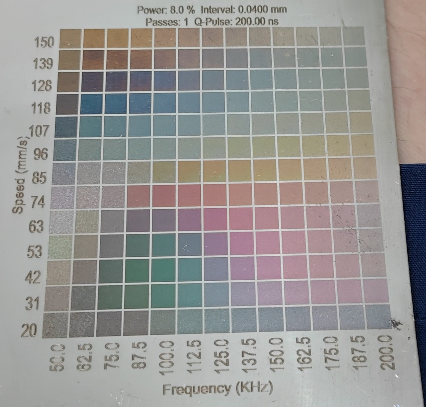 The issue though, is that I can only get color if I am running ranges of: Speed 20-150mm/s.. Power 8-10% .. Freq 50-200khz .. Pulse 150-250 … (attached image is the best I have achieved so far)
