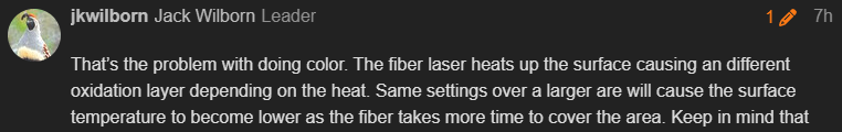 That’s the problem with doing color. The fiber laser heats up the surface causing an different oxidation layer depending on the heat. Same settings over a larger are will cause the surface temperature to become lower as the fiber takes more time to cover the area. Keep in mind that metal is very good at conducting the heat away.