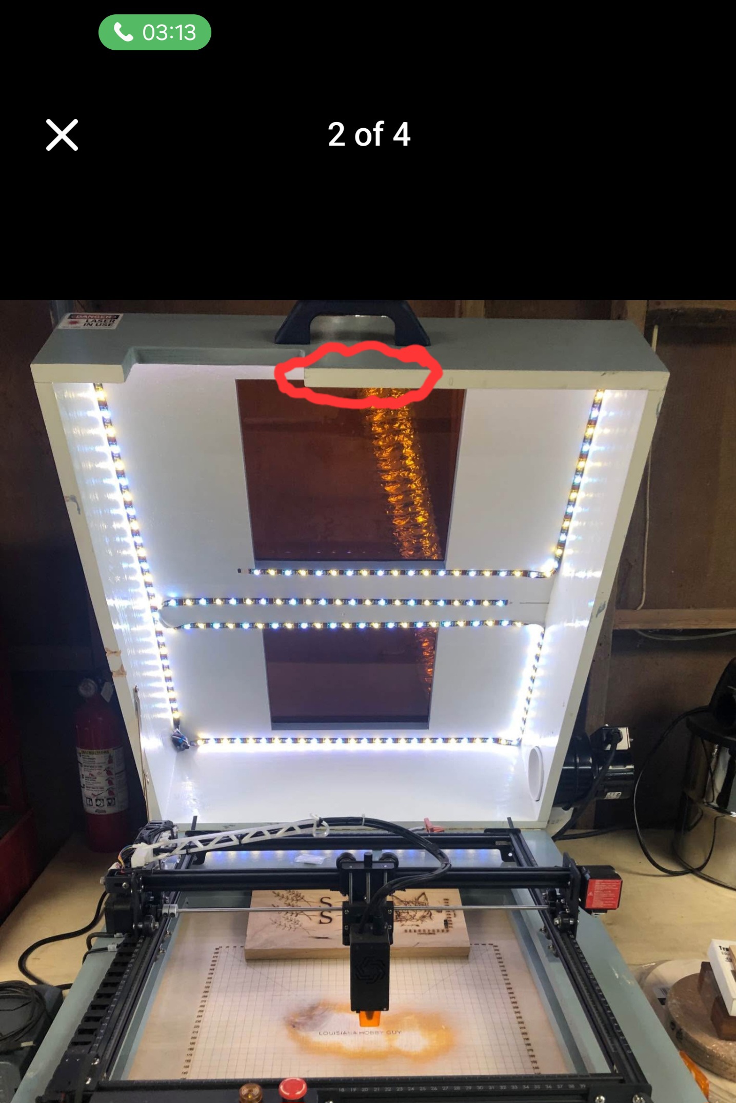 So this is my enclosure. The red circle is where the lid is directly above the center of my laser bed. I can’t mount a lightburn camera there as it would hit my laser frame closing the lid. I was thinking of getting the lightburn 5mp 150 view camera and mount it inside the lid point at center of laser bed when closed.