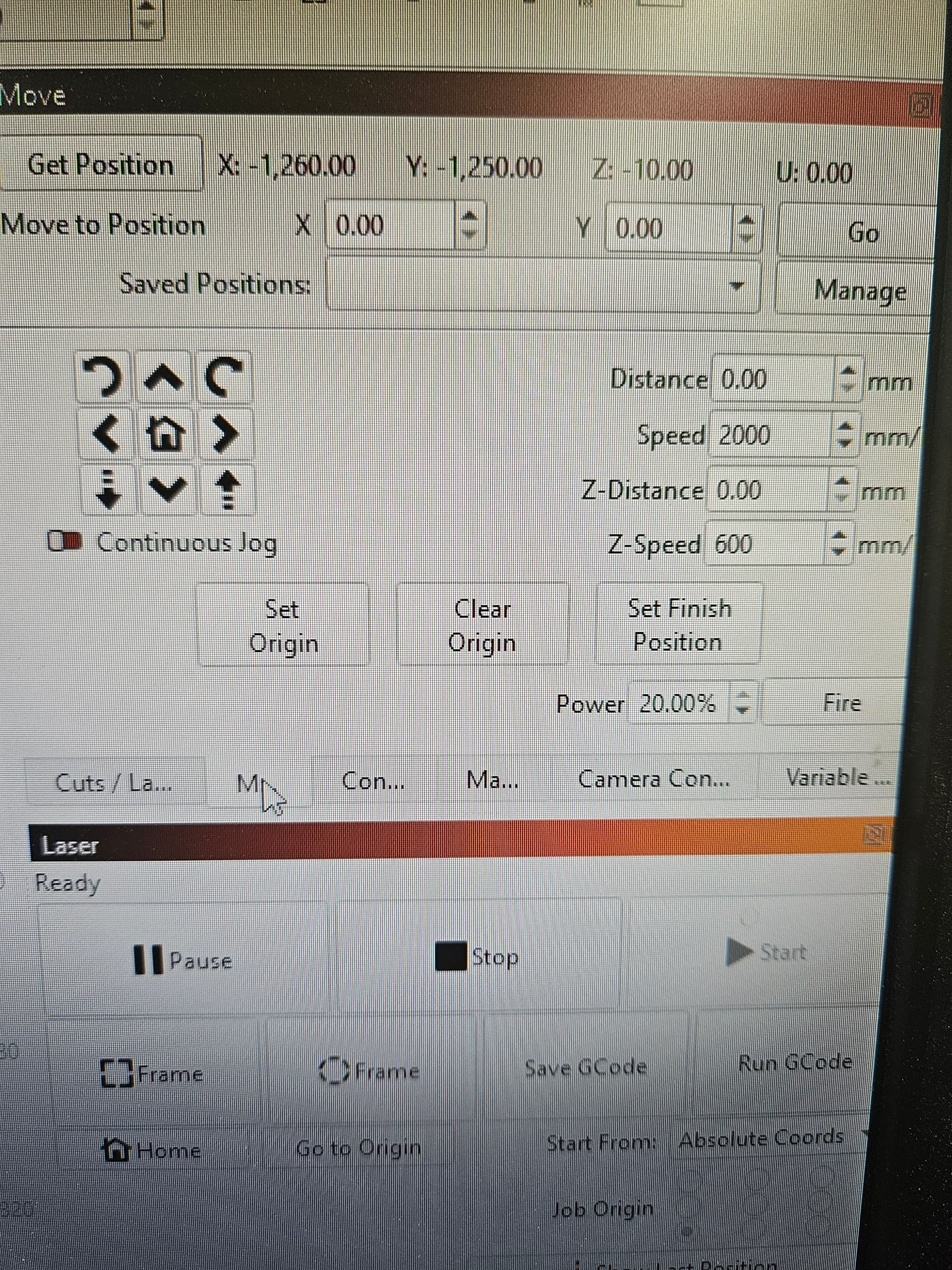 When i start LightBurn it homes the machine - that works perfectly. Homes it in the bottom left corner, as expected. The coordinates at the top of the screen show X -(minus)1200 and Y -(minus) 1200. When i go to use Move button it sends the machine diagonally to X0Y0 position in the top right corner!. Once it is there, it triggers the limit alarm (righfully so) when trying to move up or right, left or bottom does not do anything.