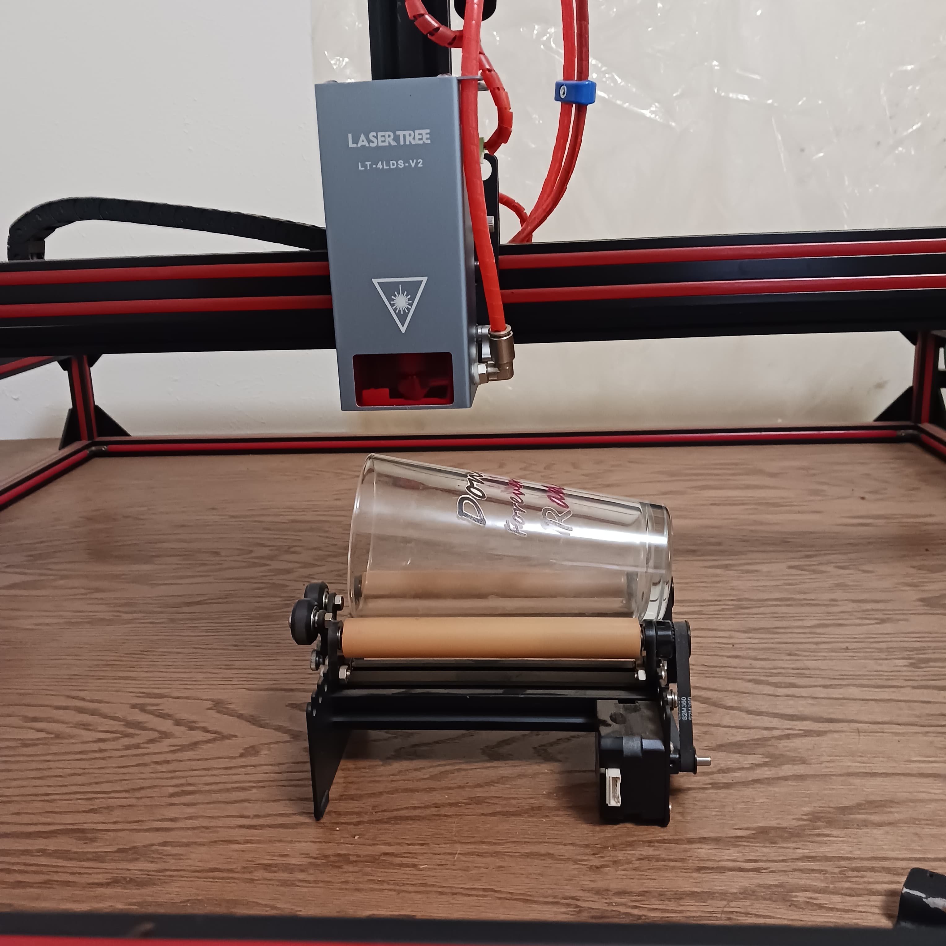 This mm/s is going to be a whole new thing to me. My other, (little), lasers are mm/m. I don’t think I ever burned anything over 1000 mm/m. And now we are talking about HOT RODS !! This is going to be fun ! I just thought of something, 50mm/s is equal to 3000 mm/m. Material defines cutting speeds, blast through balsa wood and crawl through hard wood. One more pic with roller/glass under laser. Right now the bottom of the laser is even with the bottom of the front carriage plate and there is about 1-1/4" space between laser and glass. The actuator can still go up another 1-1/2" and with the laser sliding mount plate, I can get another 2" of height. The glass in pic is 3-1/2" dia. and with another 3-1/2" lift, I can etch up to about 6" dia. glass, tumblers and what not.