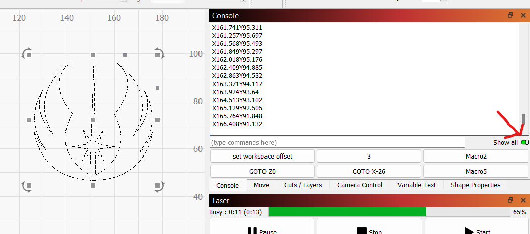 I am working with a home-brew 10w diode laser GRBL controlled laser. I am connected to a MacBook Pro, intel i9 running the latest OSX software and the latest Lightburn.