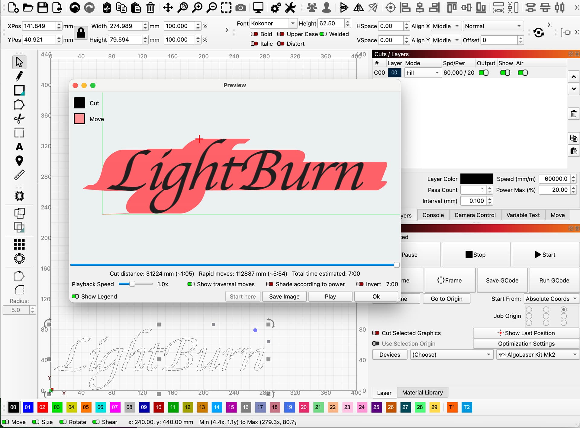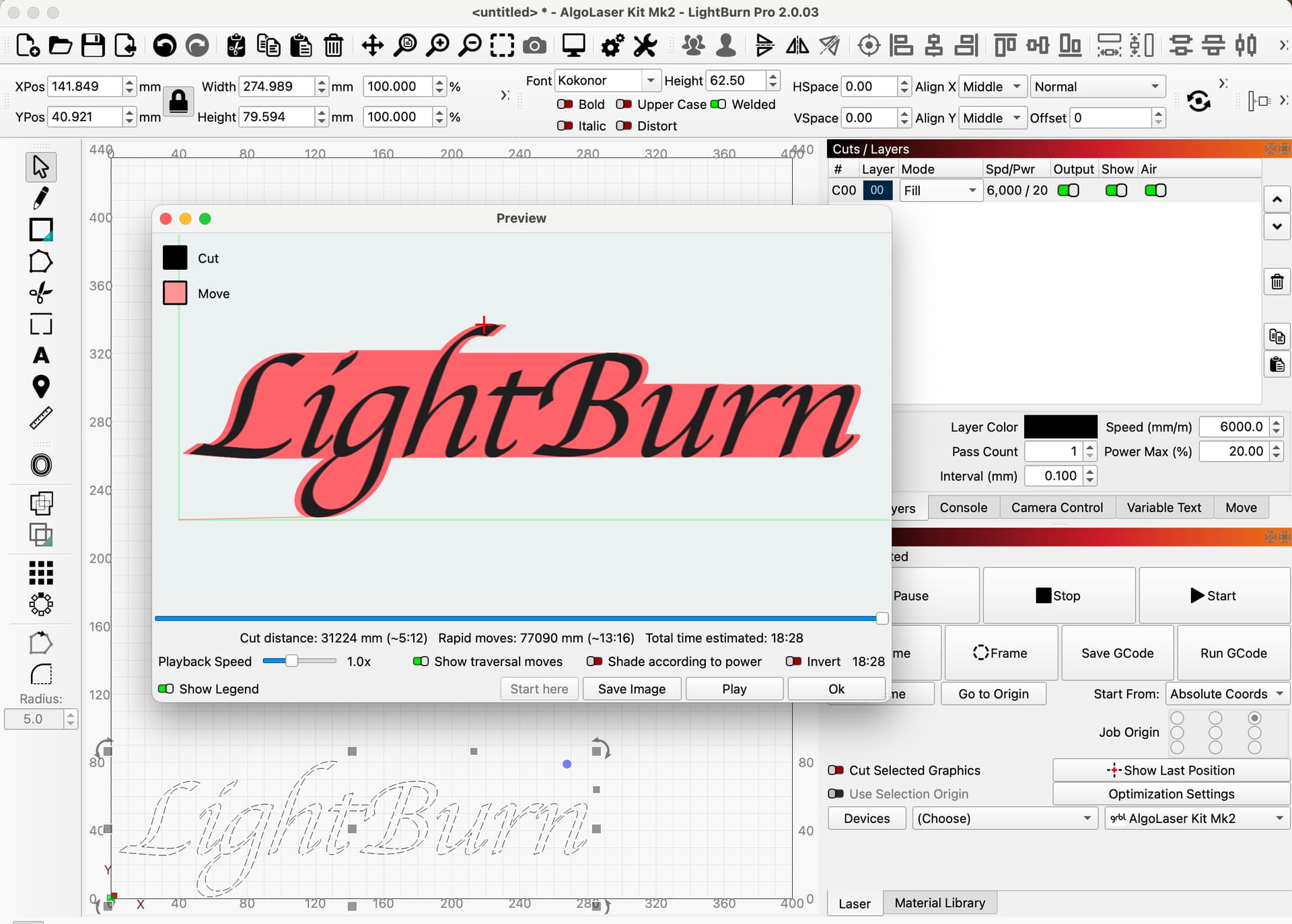 In the Preview window, confirm that the ‘Show traversal moves’ switch is on and that you see some red ‘moves’. This tool shows where the laser engraver will move when the laser is not commanded to fire (in red) and shows where the laser is firing in black.