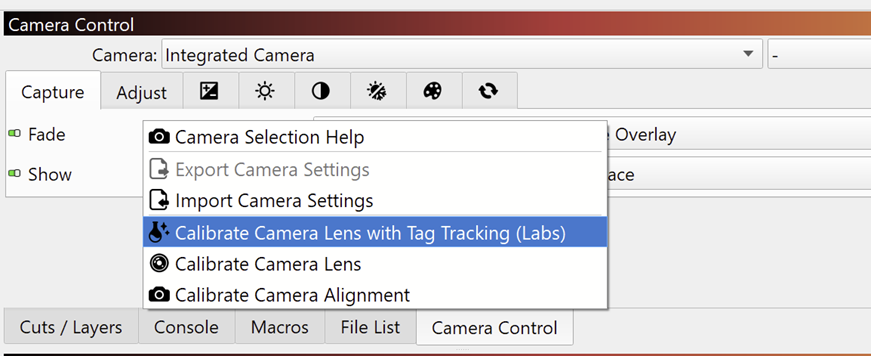 This feature is still in testing (Labs feature) but is currently the most precise way to calibrate your camera. It’s only accessible with a right click on the “Camera” window: