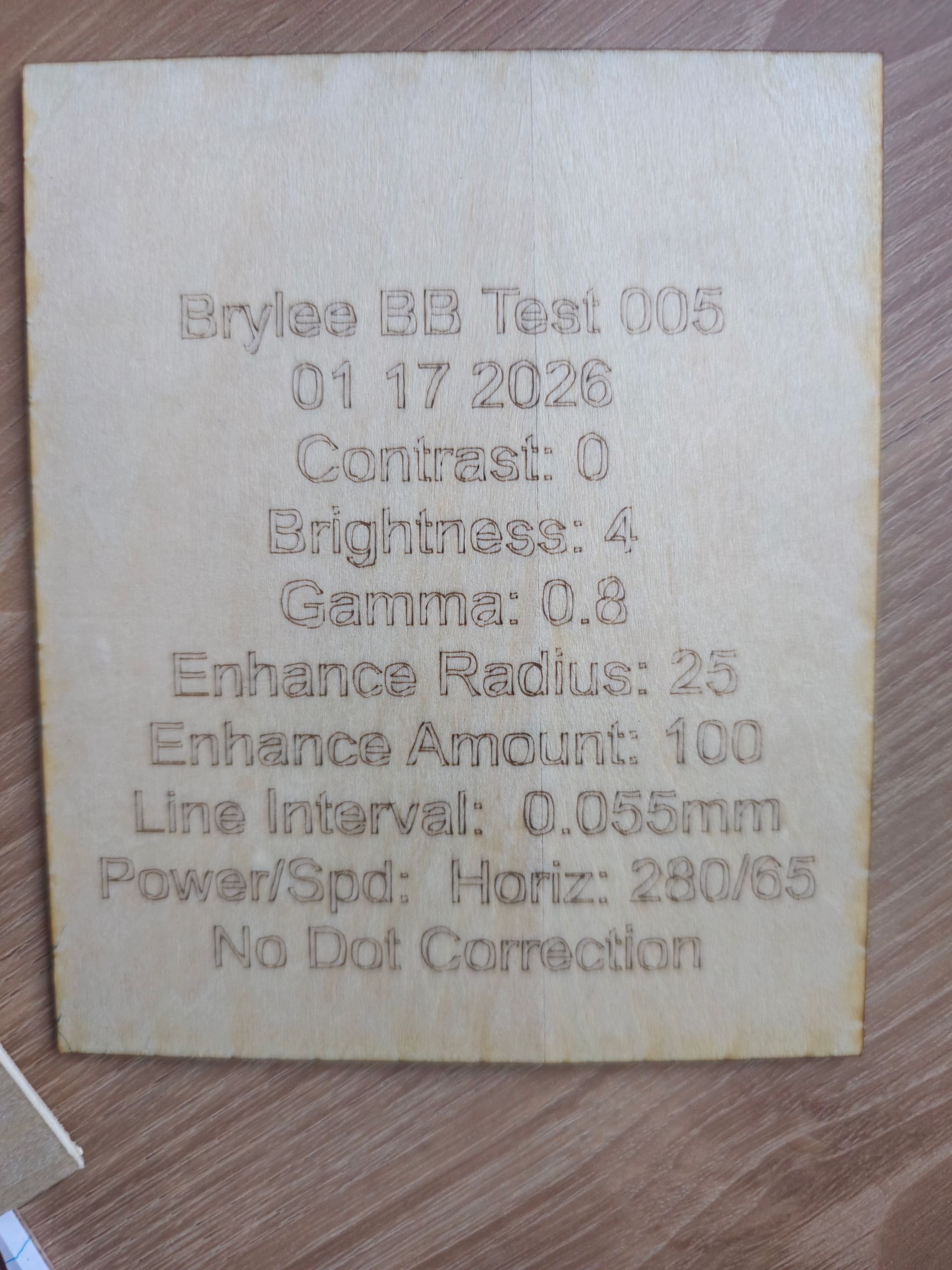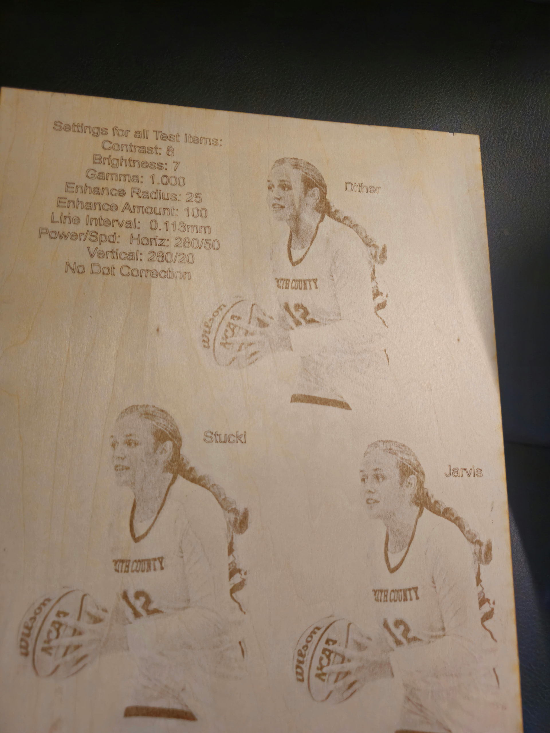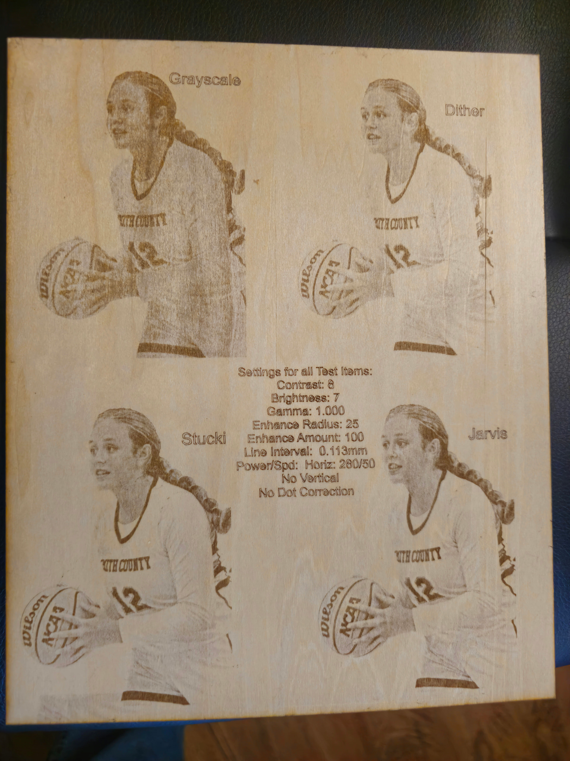 Using a 10w Diode laser, with Lightburn software. I’ve been struggling with settings for photos. My latest effort involved running identical settings in Jarvis, Stucki, Grayscale and Dither. Two different tests…two different power/speed settings.