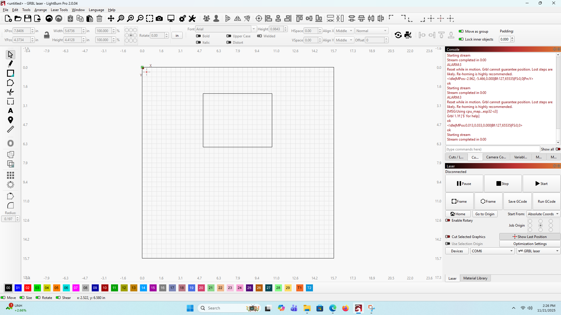 Can you give us a screen shot (WinKey+SHFT+S) of your Lightburn window with the Laser window open?