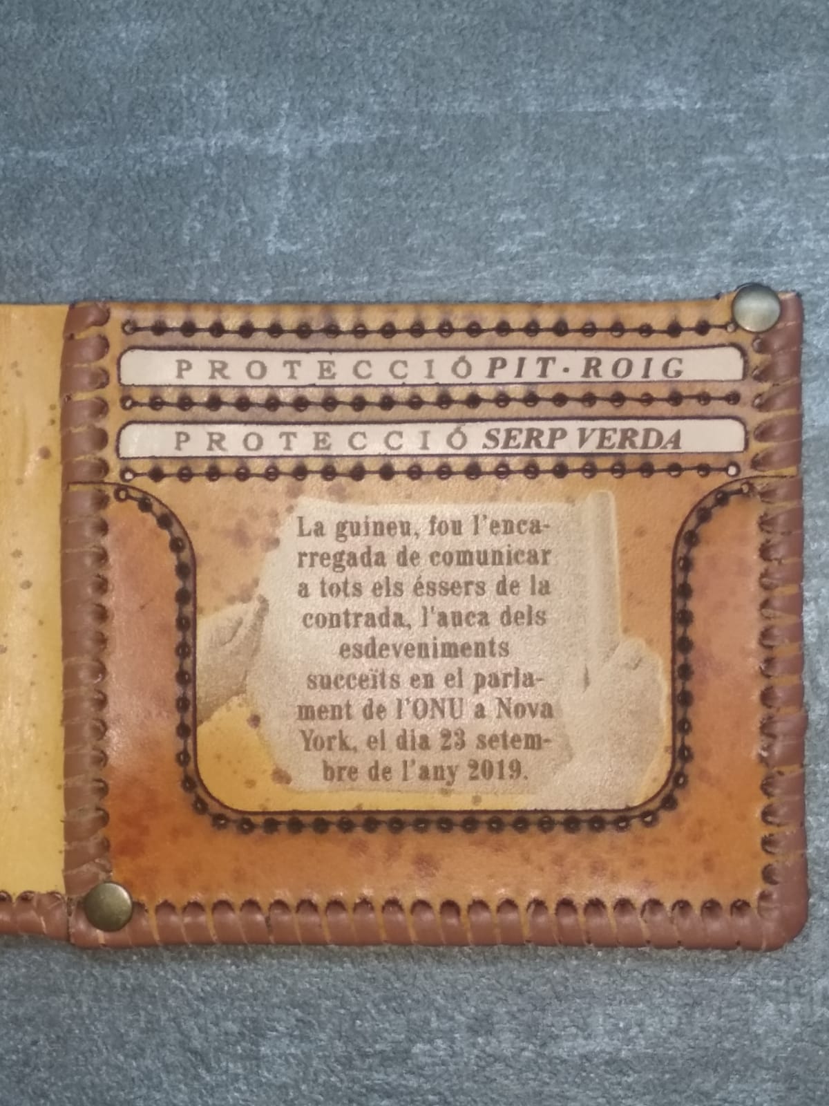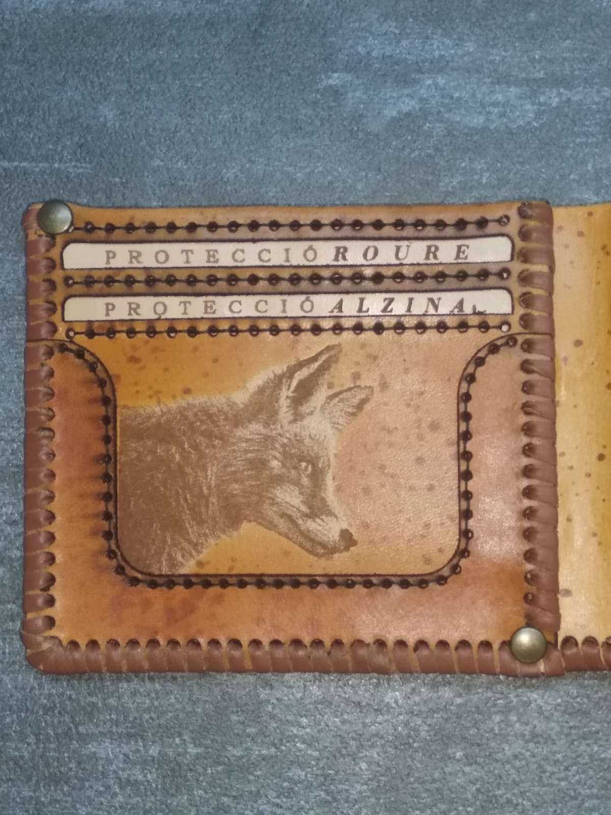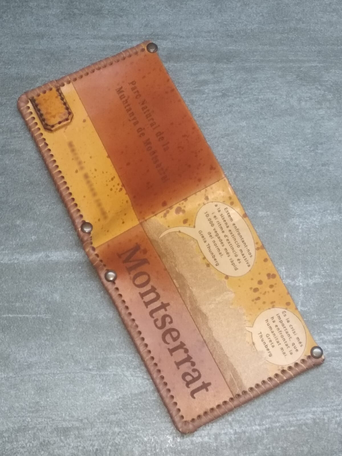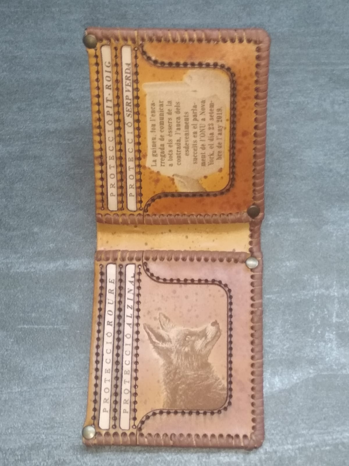 The piece has been engraved and cut with a 10-watt NEJE diode laser, dyed using an airbrush and brush, assembled by hand, stitched with nylon thread, and reinforced with leather strips that include a nylon core on the back, along with four rivets to ensure strength and durability.