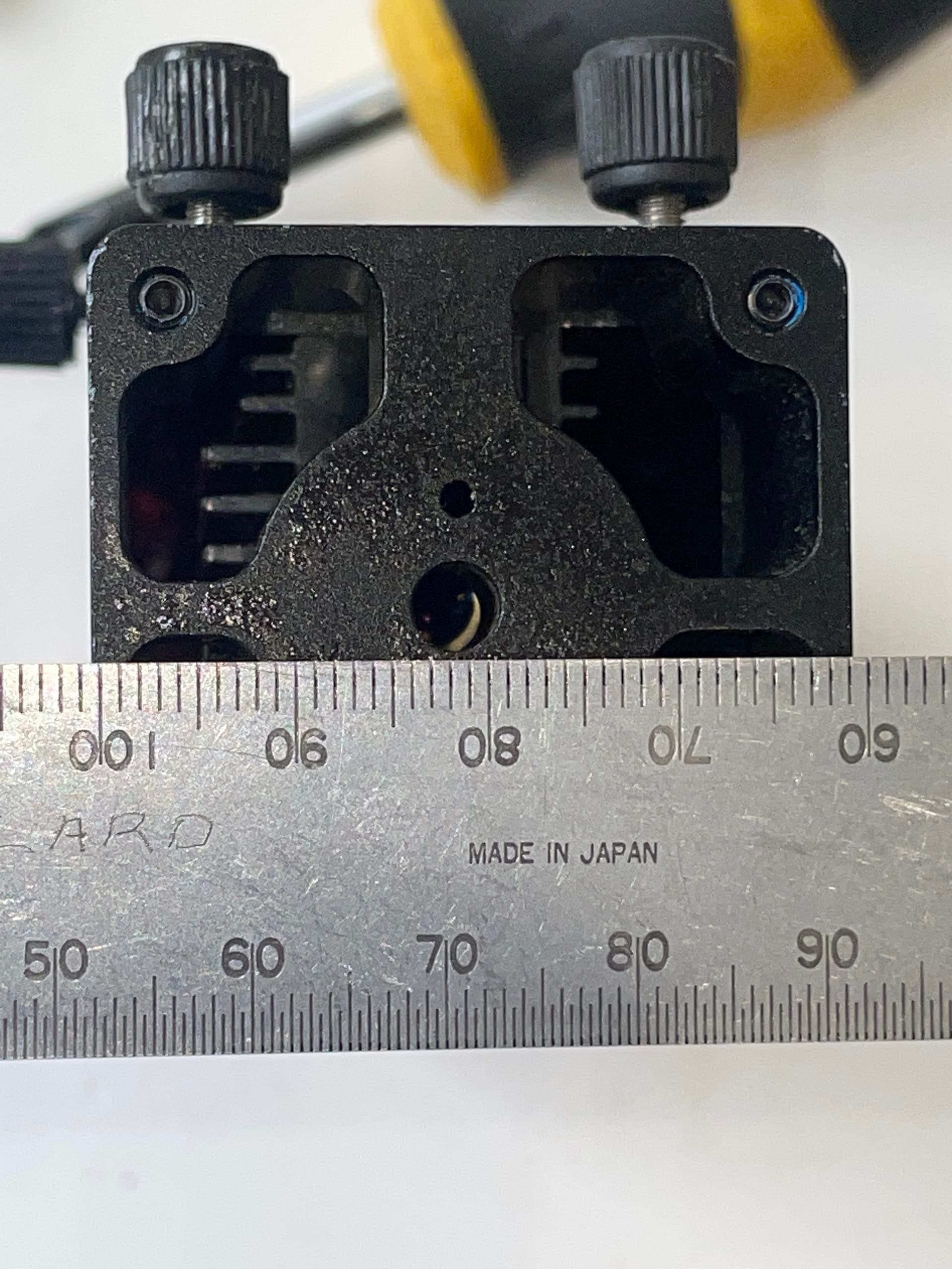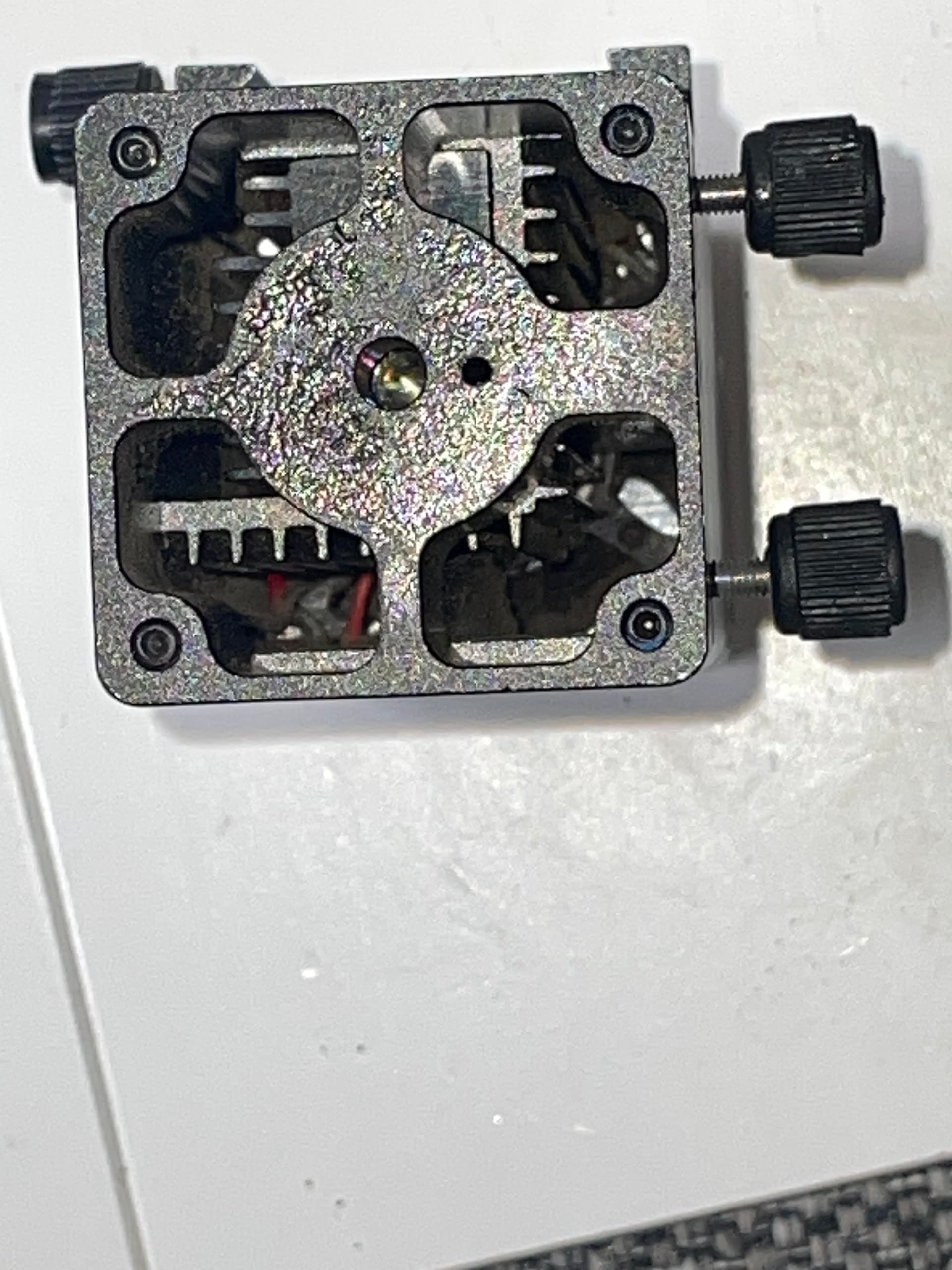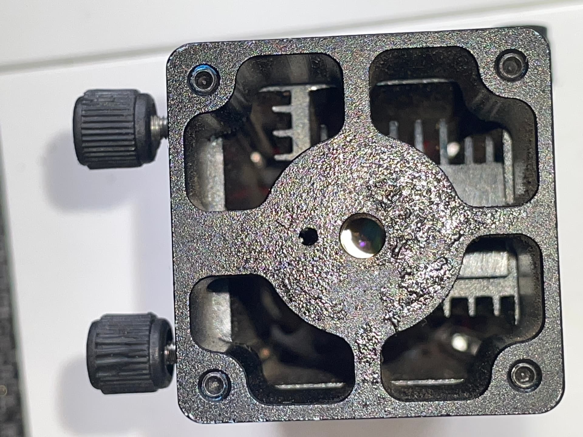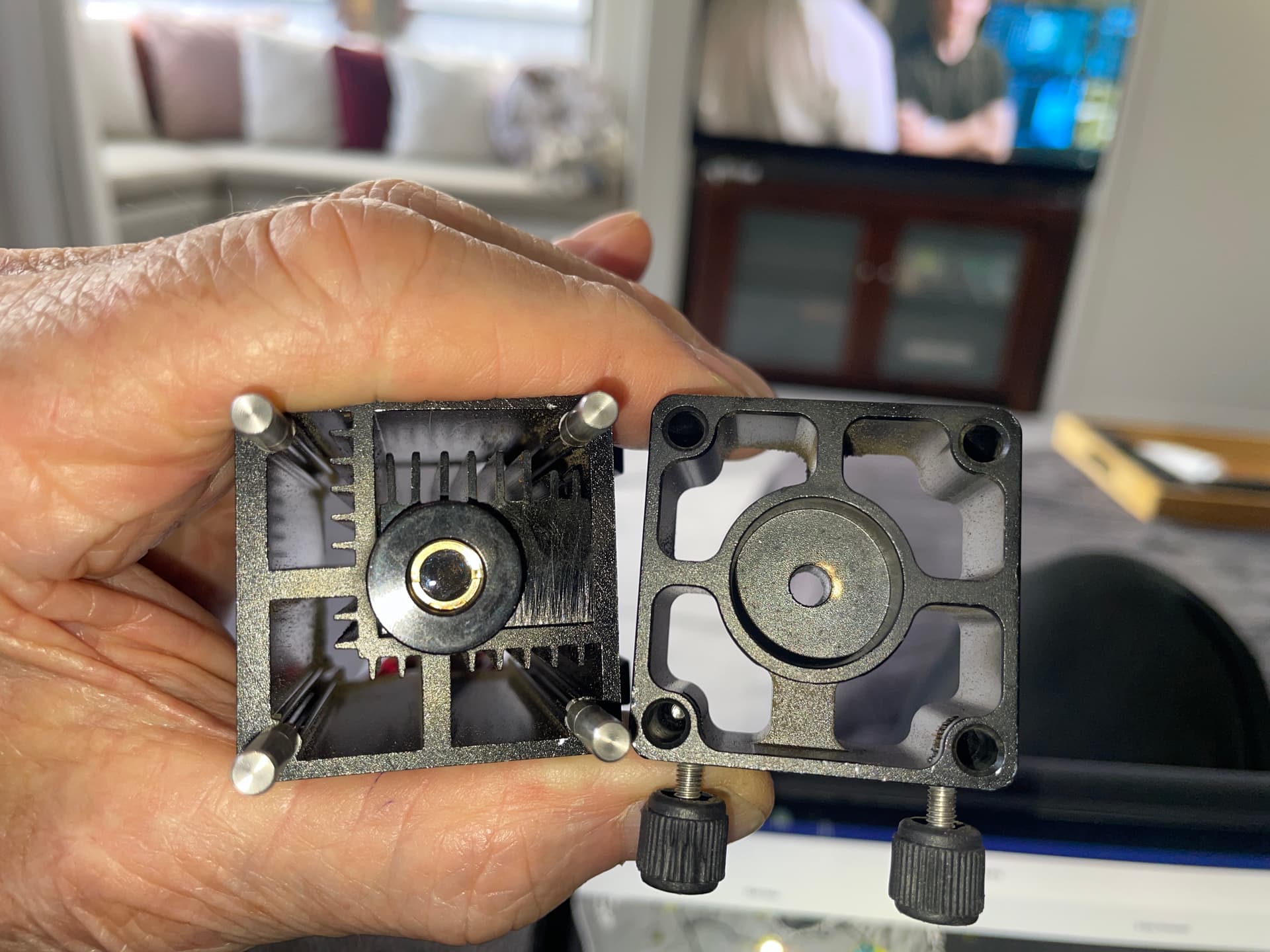 I had thought of drilling it out too but decided not to as it’s size could possibly be correct for air assist air flow. I measured the lens position in the module itself and found it is also offset from centre as well. So the hole in the block can only be centred in one position out of the four ways. This begs the question why the spigots/mounting posts aren’t arranged to only allow the block to be fitted in one orientation. It would only take one of them to be a couple of millimetres off the perfect square that they are now.