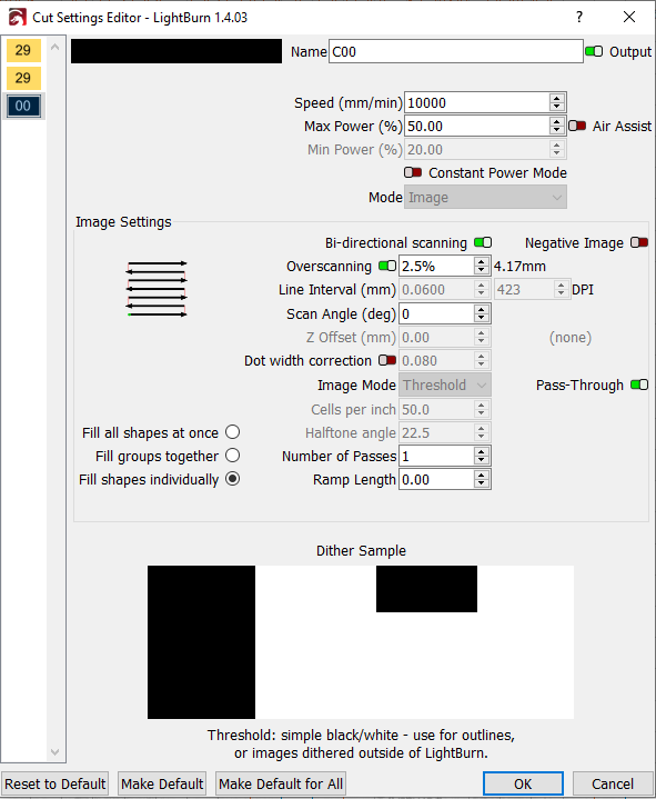 (my personal opinion) don’t use pass-through. Load the image into LightBurn, choose one of the available algorithms and do the tests. Much more predictable.