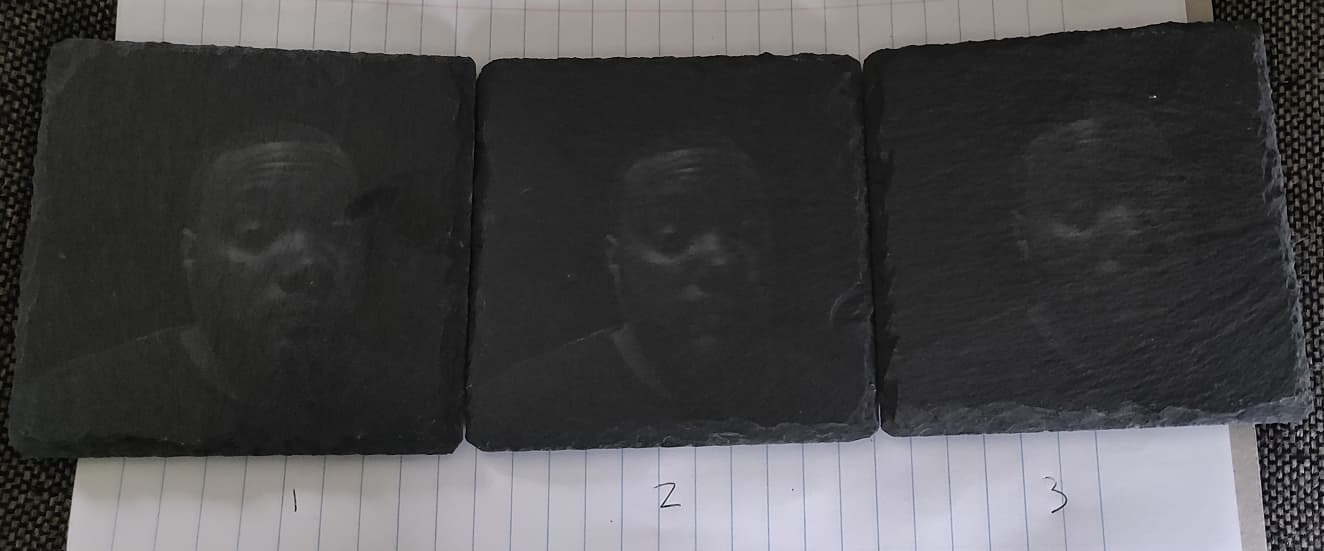 Perhaps grayscale may be an inaccurate way of explaining what I’m talking about, so I’ll send some more pictures to show what I mean. The coasters I would engravings used to manage a lot of detail, but now can’t seem to handle any at all. It seems as though the power of the laser has completely lost it’s range. I’ll also upload an image of how drastically different that grayscale image I uploaded an engraving of earlier used to be able to engrave. I’m fairly sure at least the photo engravings were all 10k, I know they were definitely faster than 5k. I had done a lot of testing to try to be optimal on how quick each engraving could be done without losing quality.