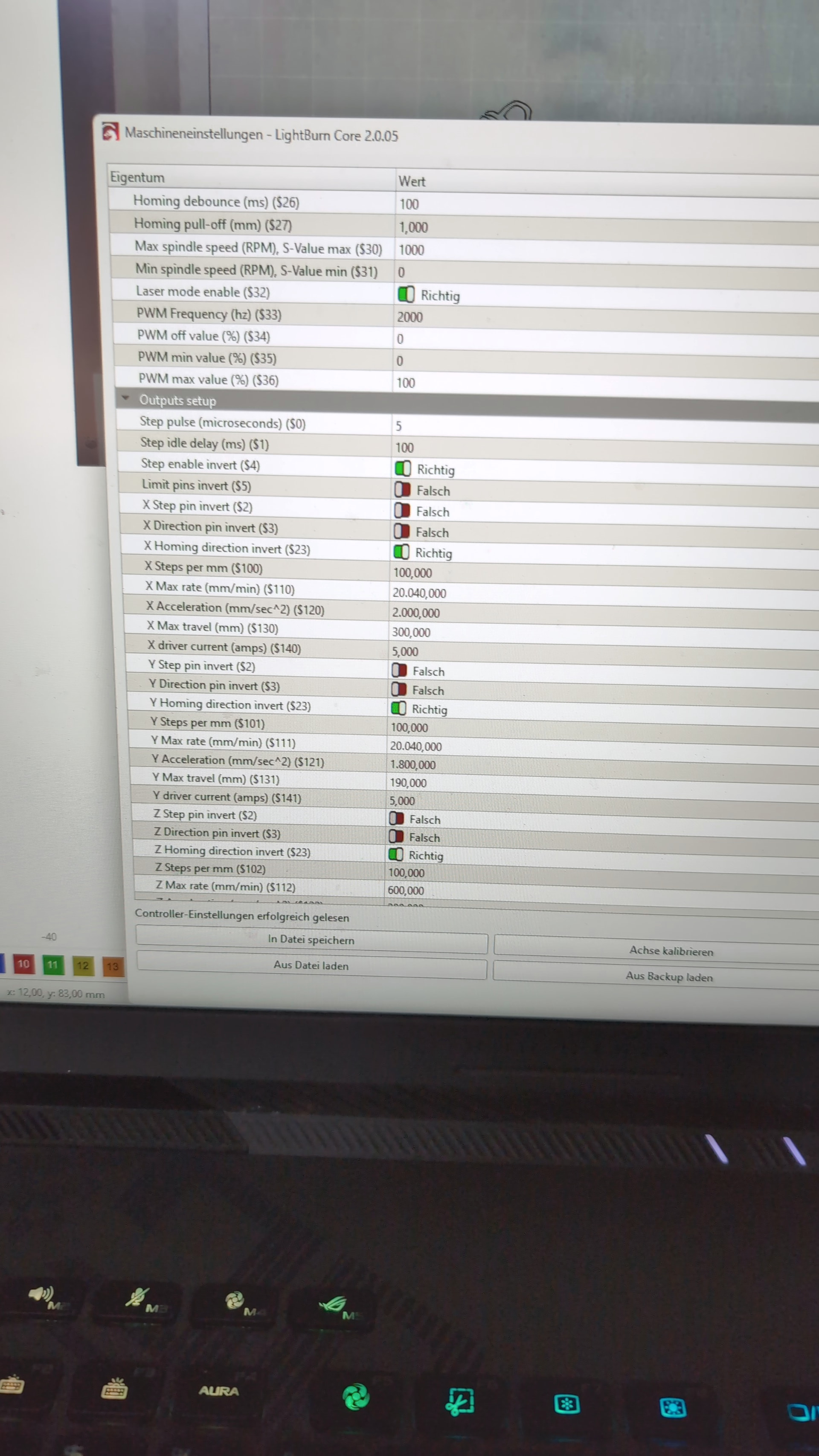 Move, or Jog. the laser until it is sitting on the limit switches. Then enter ? in the Console window. Now move the laser off the limit switches and do the same thing again.