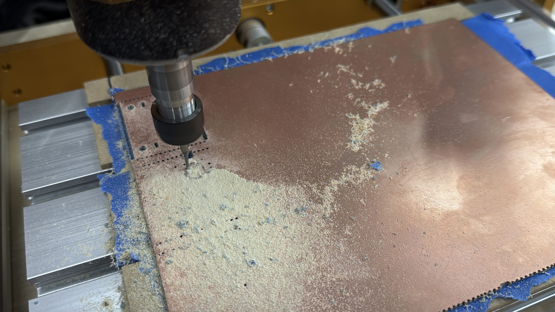 - Basic clamping: Issue here is the boards have a tendency to pull up in a burr end mill. On the edges it was fine but cutting a larger area (e.g. 150mm x 200mm) the middle would pull up into the bit when milling.