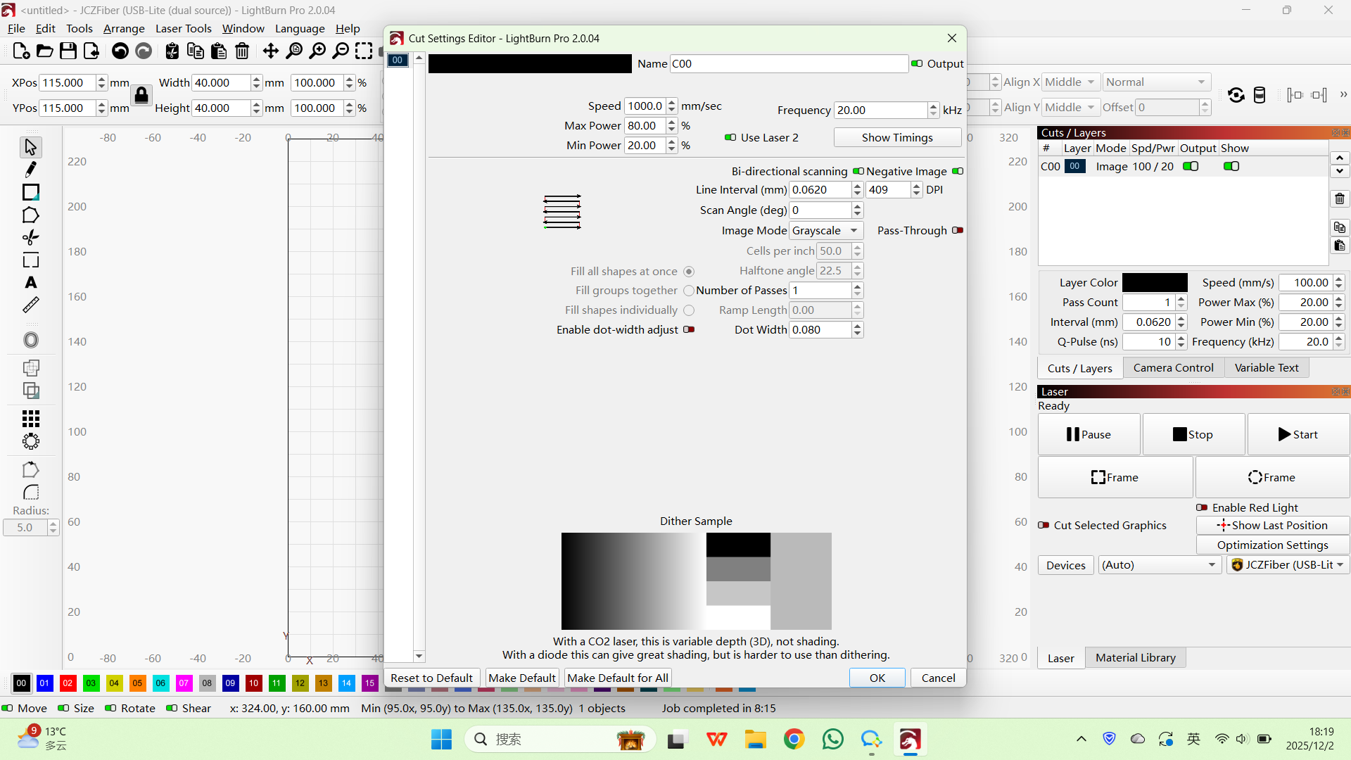 Hi, I have a dual laser engraver which combines 30W MOPA with 20W diode. And yesterday I tried to engrave a photo into a 4×4 wood sheet, and I set parameters like 800mm/s speed, 20kHz frequency, and 100% power. And I was sure I used the diode option to engrave.