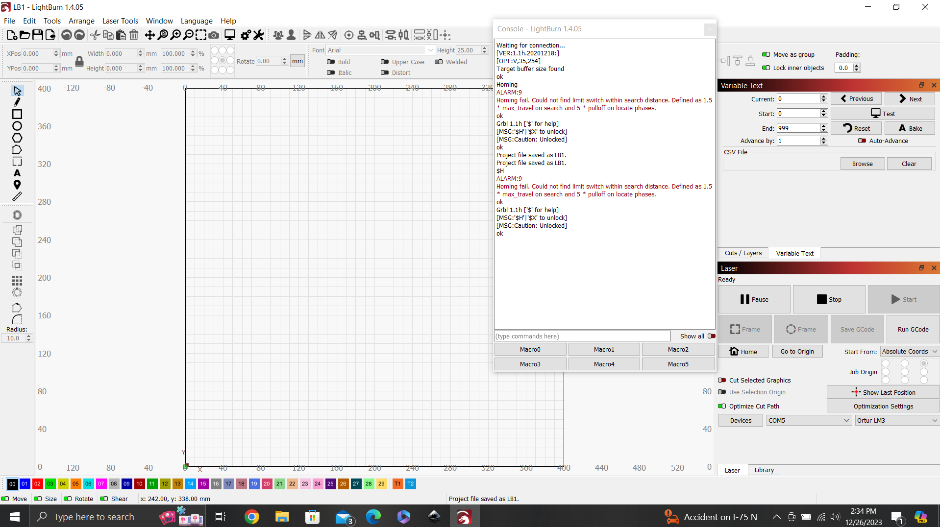 Jogging works in laserGRBL. When i try to home it goes back to wherever it started at. If i jig and hit home it goes back to where the big started, if that makes sense.