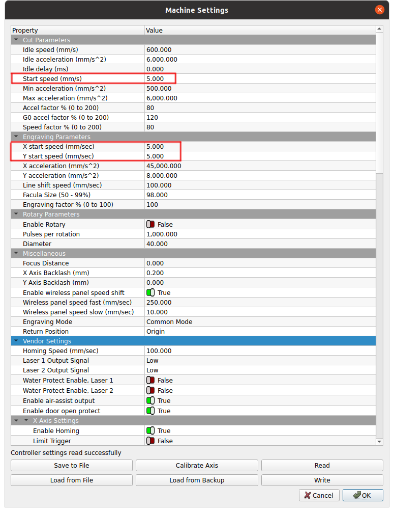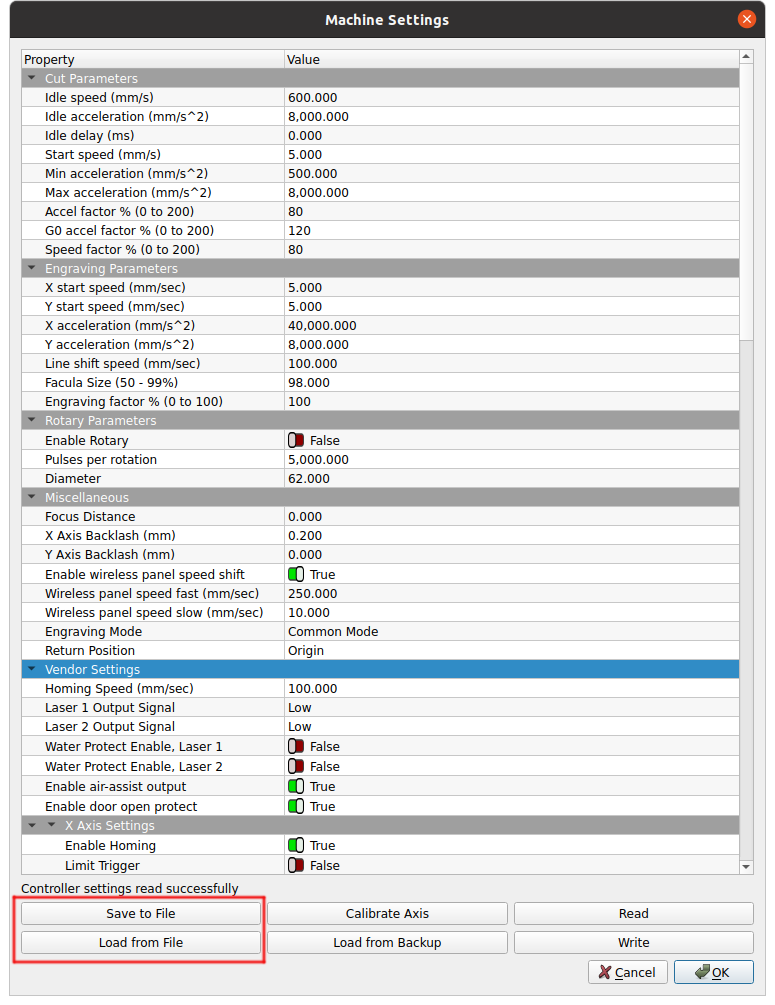 Might want to save the settings of the Ruida while you’re in the Machine settings. If your controller dies and you need to replace it, all of the vendor settings will be lost. I have a backup on a local disk, a usb stick and on Google.