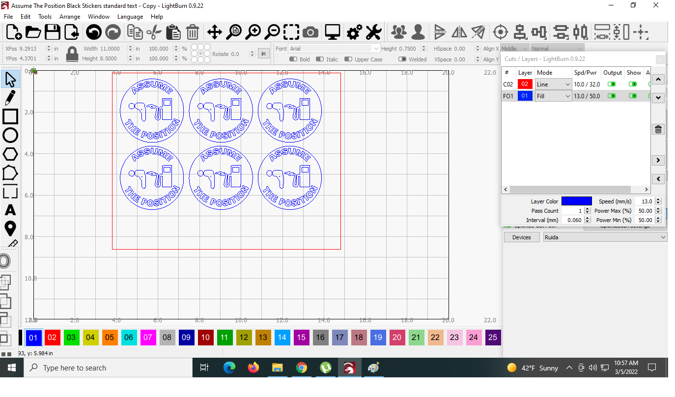 I am trying to print this graphic from within the file menu, but the body of the man bending over is not printing. I have tried changing things around, such as layer colors, line/fill, etc, but nothing helps. It seems as though it should print, as everything else does, but… Can anyone help me with this? Also, the LightBurn template is set to be 8.5" x 11", but it prints out at 6" x 4.5". Can anyone tell me how to get it to print at the 8.5 x 11 that the template is set at? Thanks!