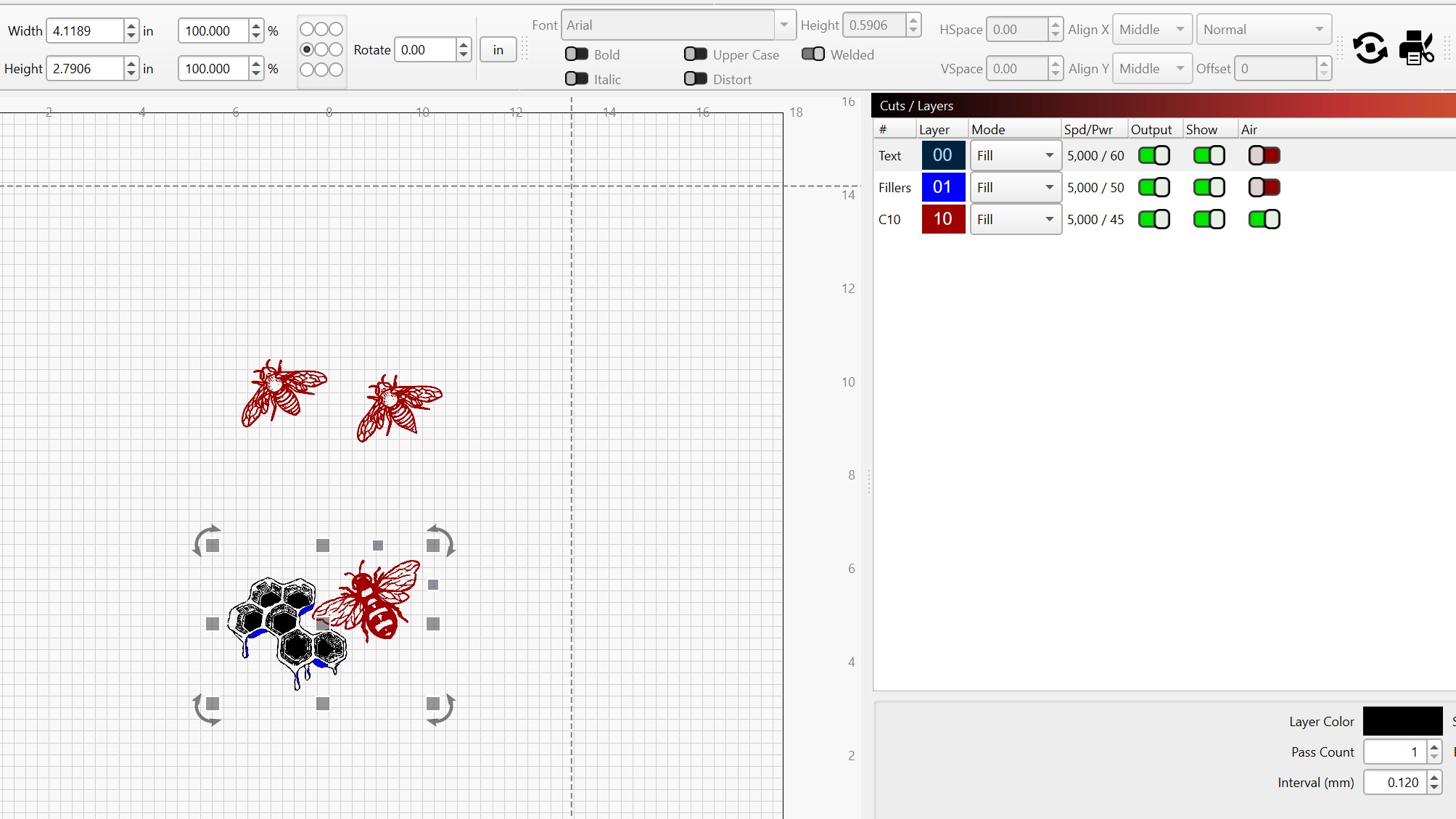 In the Cuts/Layers Window the Output switch next to Spd/Pwr is switched on for both layers.