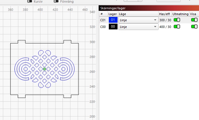 Click on the C00 line in cuts and layers, drag blue line below black line. All blue will cut before black.