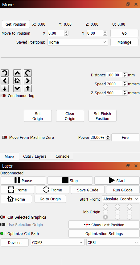 Also, after I zero and start the job, my machine tries to start at a point that is no where near the desired cut. I tried burning a 50x50mm box at x50, y50. When I hit go, it moved the laser to the far X axis side to the stop (past x400). When I jog using the direction controls or the ‘move to’ commands, it goes to the right x50, y50 spot. What is going on?