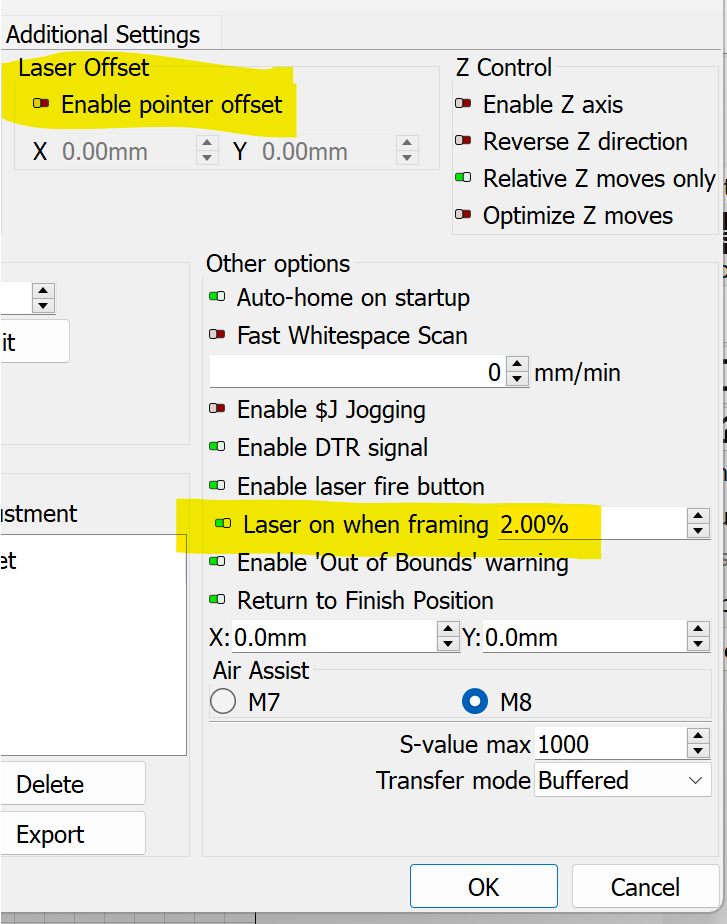 If you have an additional laser pointer for the framing, you would set the offset to your actual laser and turn off “Laser on when framing” in the “Edit > Device Settings”: