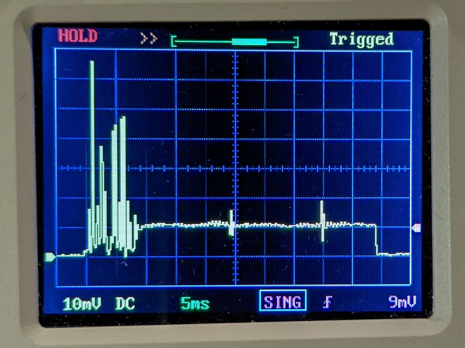 That’s a little DSO-150 scope with a Tek Hall-effect probe clamped around the tube’s cathode lead.