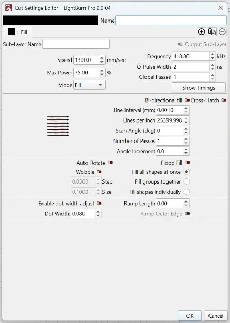First photo (assuming I can get this to work). This is the process parameter for Magenta color on titanium sheet material, T2, 0.7mm thickness with a 60w MOPA with a 290mm lens. It is a super color on the sheet material. Please notice that the pulse width is set at what I am given to understand as the lowest setting, that is “2”, and the LI is 0.001. My first thought was that, given the LI that I would burn through my sheet. Well, it doesn’t. It burns beautifully. Yes, the speed is not slow, but it is not all that fast either. The frequency is on the low end for my machine, but is in the 400s, so I didn’t think that was so low. The power is high, but the surface on the sheet is still smooth after the burn, so my thought was that the moderately high speed and frequency, plus the shortest pulse width were the mitigating factors against the high power, with the LI pulling it in the warmer direction.