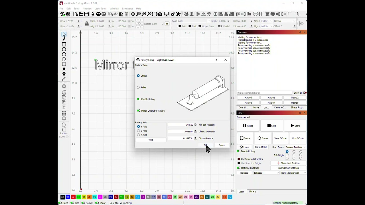 Note how the green job origin dot moves off of the object when rotary mirror is selected.