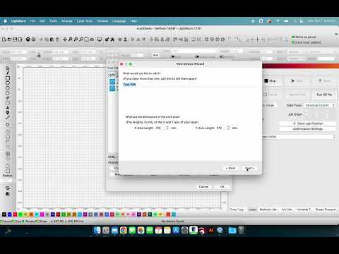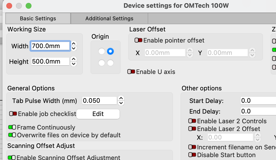 In “With” and “Height” you should insert with and height of your machines laser bed.