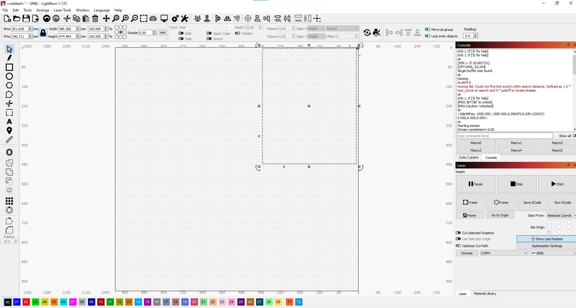 Thank you for the encouragement and because of this I have now managed to do some shaapes and fill them, great stuff, my only problem now seems to be the working area being restricted to the top right of the grid in he space I have lined on the screenshot, if I go outside of those lines the laser bounces on the frame. Is there any way I can line up the grid to correspond with the laser bed so I have a full screen to work on.