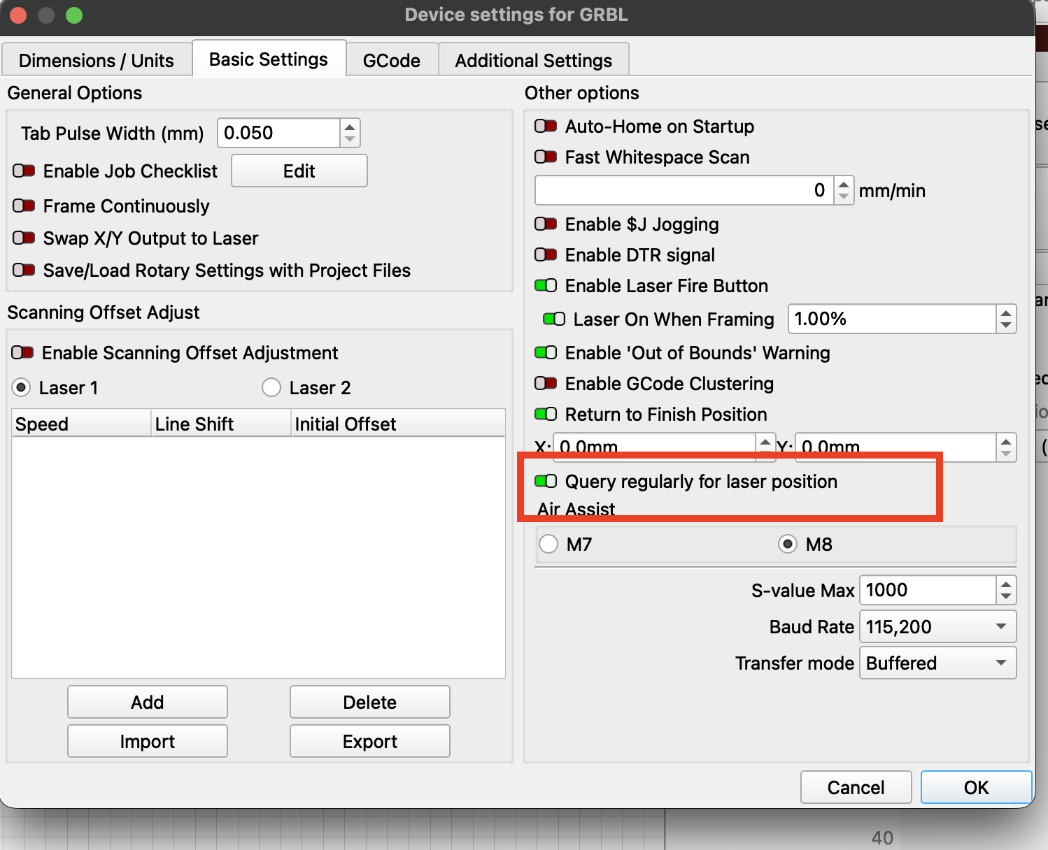 I did turn off the home-upon-startup and didn’t notice the homing problem. I have to run it for a day to see if that is the problem. I don’t think the board is rebooting though, because the screen for the controller does not change.I would think that if it was rebooting, the screen would run through it’s routine. this whole thing has been a head scratcher. I did read online that if it was a comm problem over USB that I could use an ethernet connection which would bypass and usb problem. I don’t see any ethernet connector on the cohesive 3d board. I guess lightburn supports ethernet too. It sure is a great program.