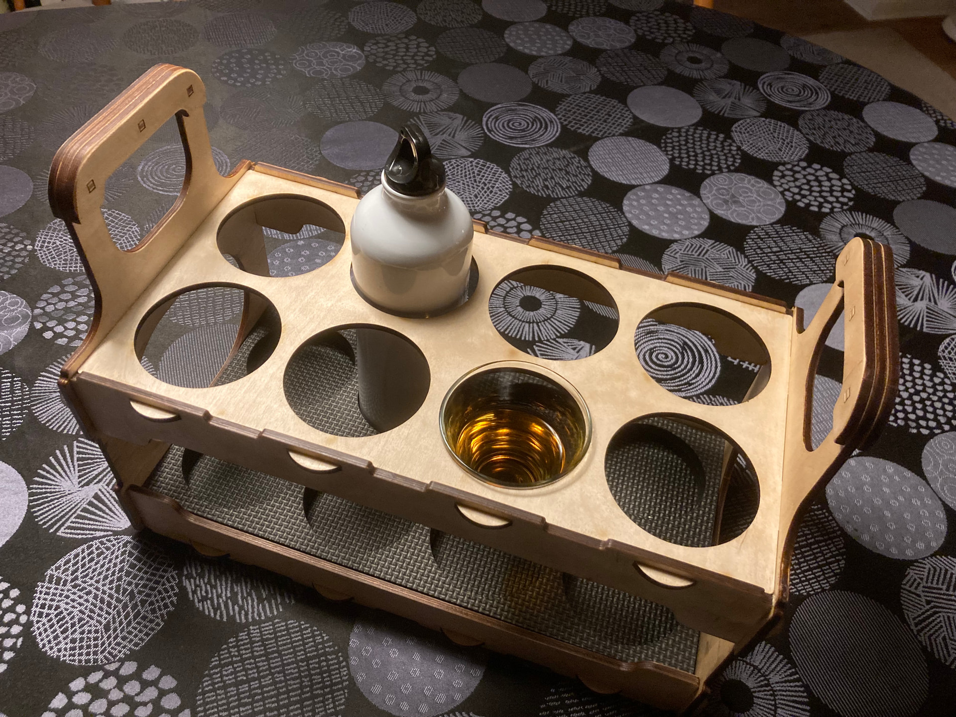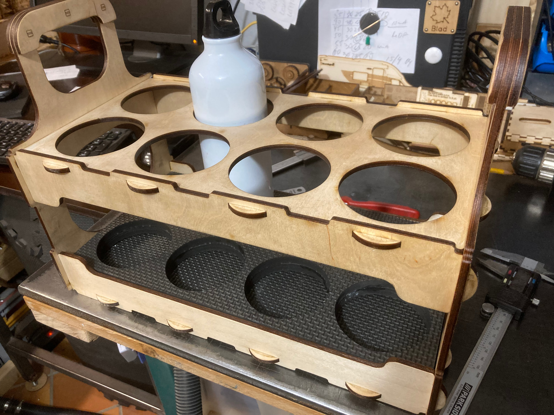 I have received a request for a water bottle holder from a local volleyball club that must not doesn’t weigh too much but can hold 8 bottles of water each, each one liter.